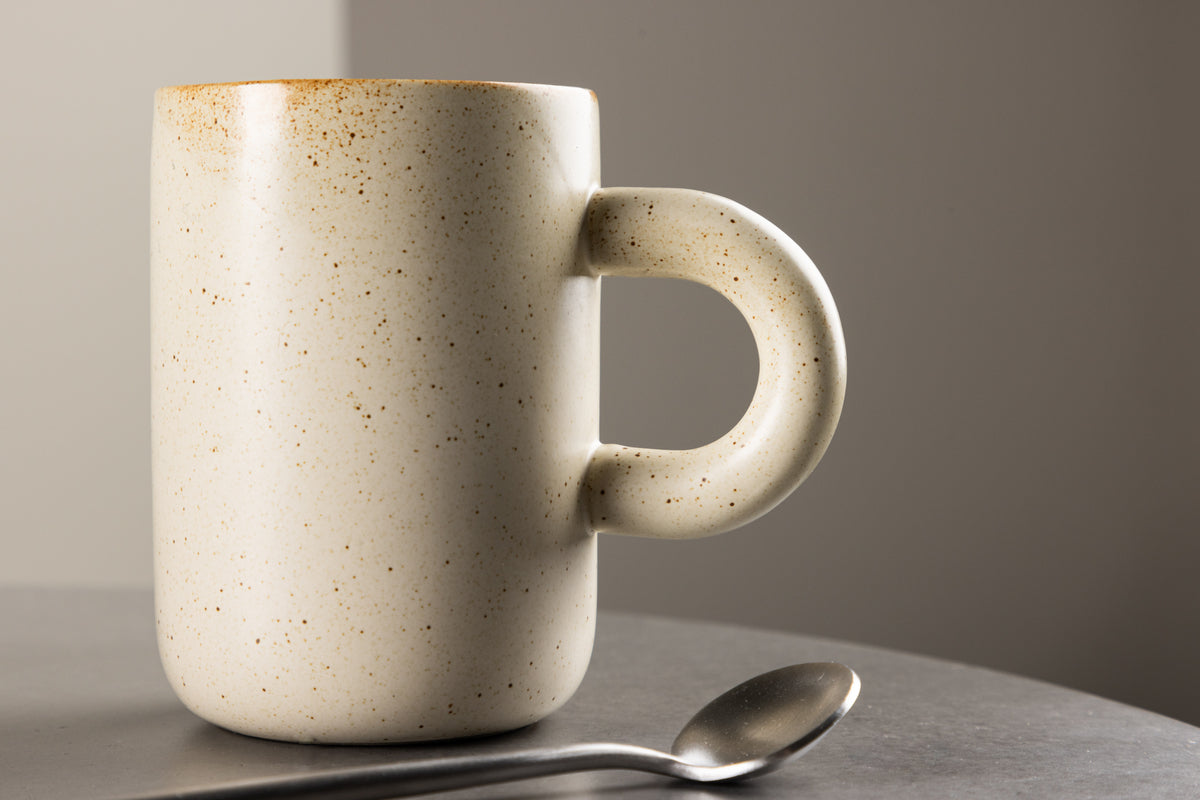 Den beige kop med små sorte prikker tilføjer et moderne og trendy præg til din drikkeoplevelse. Med en diameter på 7 cm er koppen perfekt dimensioneret til at være den ultimative følgesvend til din yndlingskaffe.