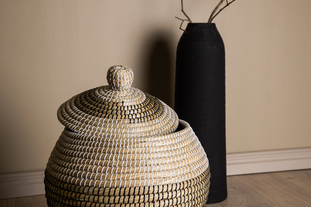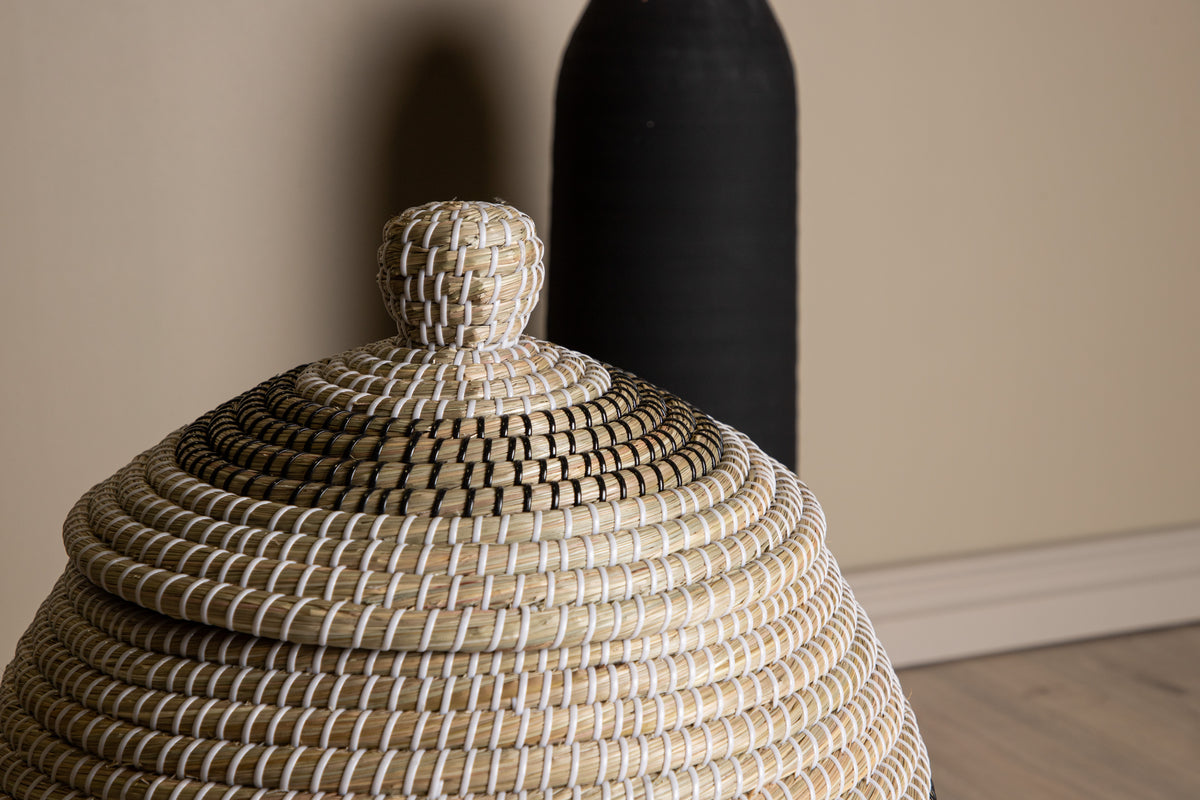 Chennai er vores runde opbevaringskurv med låg! Denne kurv kan bruges til meget; Håndklæder i badeværelset, mindre opbevaring i stuen eller hvorfor ikke fylde den med legetøj i børneværelset? Den er lige så dekorativ som indretningsdetalje, som den er funktionel og passer ind i flere rum. Kurven er naturfarvet og grøn med hvide detaljer. Dekorer dit hjem smart og pænt!