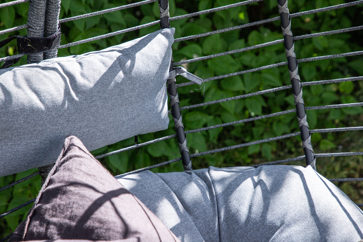 Oplev total afslapning med vores elegante hængekøje Bacolod. Bacolod har en robust stålramme og er dækket med polyesterreb, hvilket giver den et rustikt og naturligt udtryk. Hængekøjen leveres med en komfortabel sædepude og en grå polyester rygpude, der sikrer ekstra komfort, mens du slapper af.