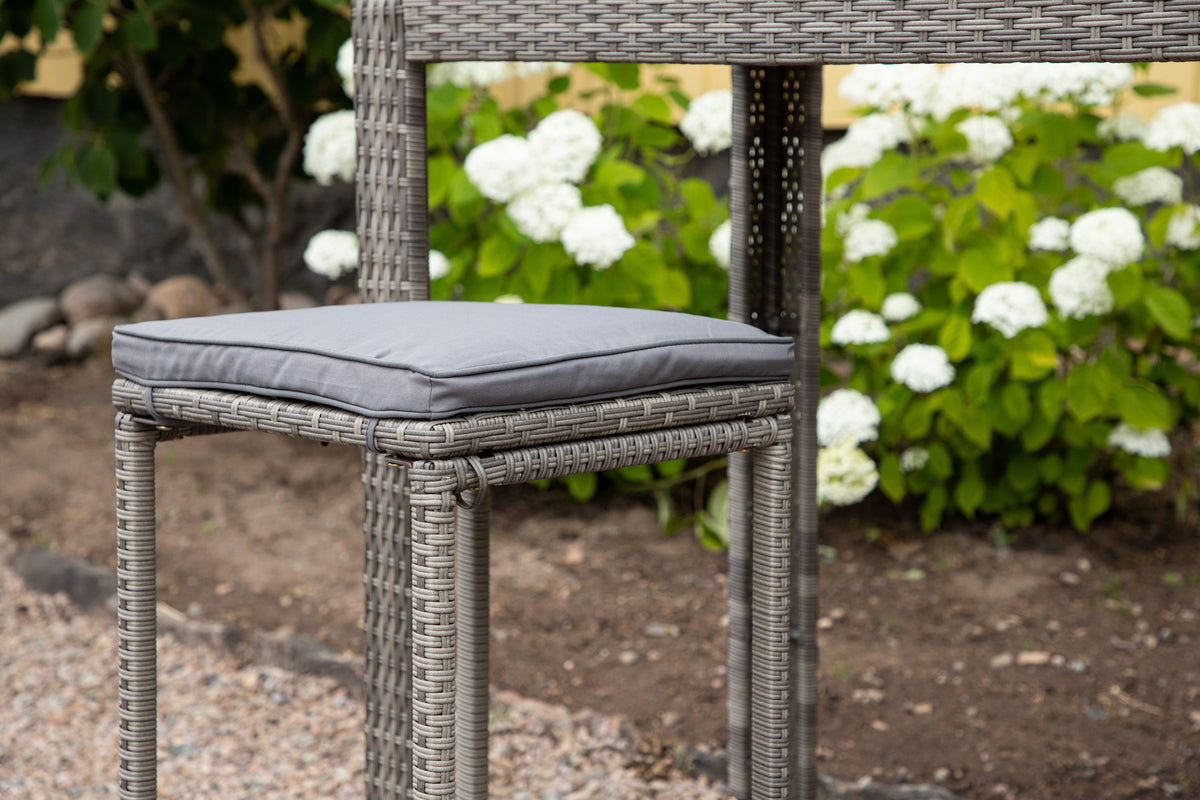Dette barstol fra Alo serien er lige så praktisk som holdbar! Denne barstol kommer i en flot grå farve og er lavet helt af aluminium og syntetisk rattan, der vil modstå tidens tand. Stolen har også en integreret fodstøtte for ekstra komfort. Komplet med et matchende barbord og indret terrassen med en indbydende spisegruppe, der løfter terrassen til nye højder!