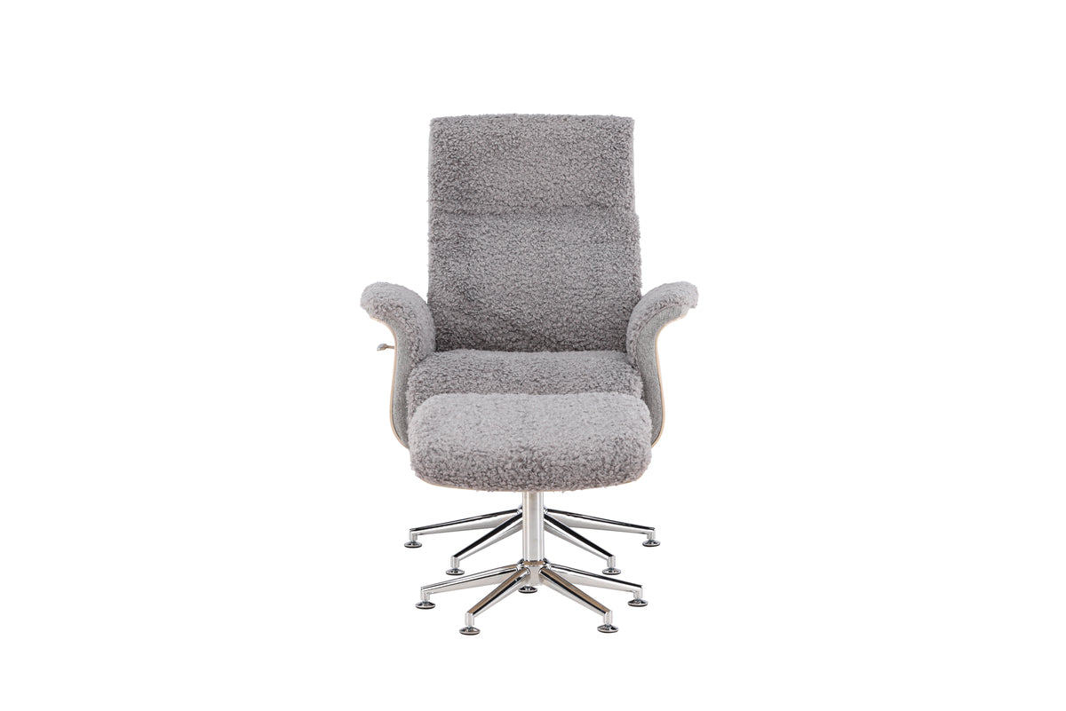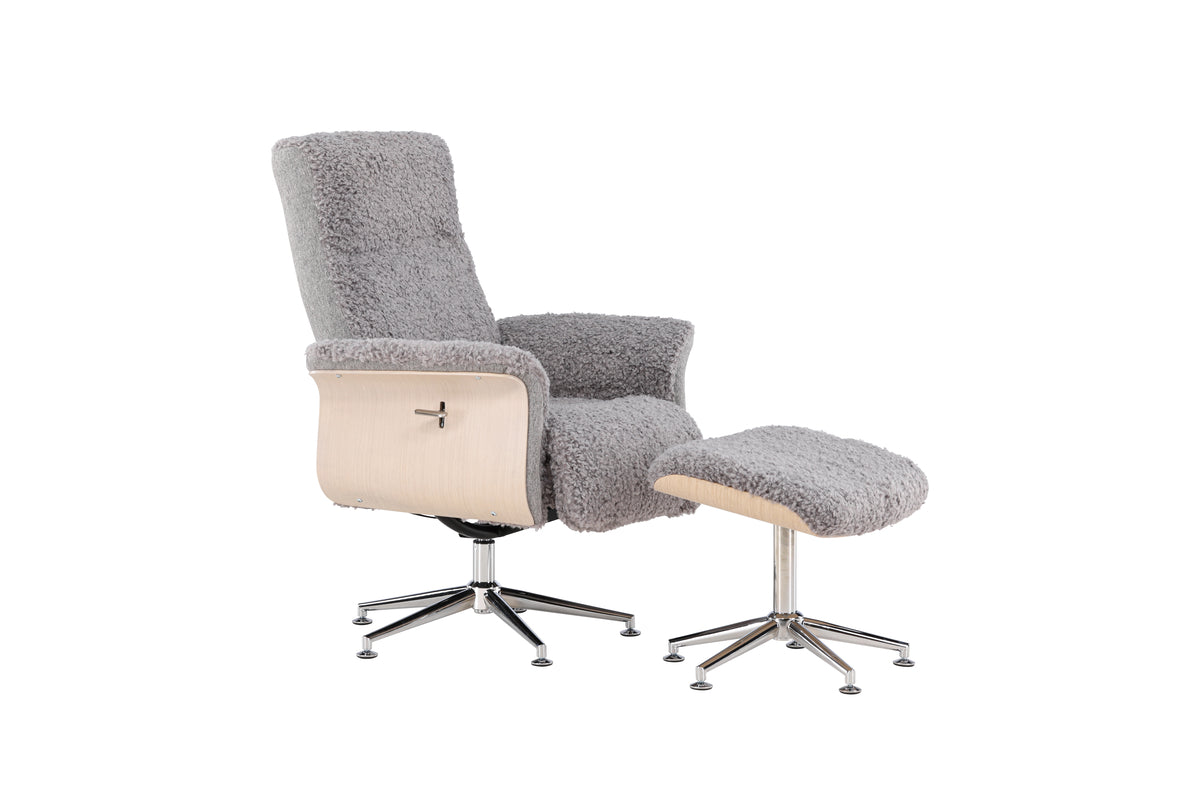 Hagön lænestolen udgør en tidløs investering til dit hjem! Med omhyggeligt design og gennemtænkte detaljer repræsenterer denne lænestol et mesterværk af nordisk design. Klædt i et blødt, pelslignende gråt stof, giver Hagön en følelse af luksus og velvære fra det allerførste øjeblik. Den træramme i hvidvasket farve bidrager til en luftig og moderne æstetik, der problemfrit blander sig ind i enhver indretning. De elegante kromben tilføjer en subtil glans til designet. Armlænene, behageligt afrundede og designet til afslapning, samt den medfølgende fodskammel giver ekstra støtte og komfort til trætte fødder. Derudover kan ryggen justeres for at maksimere komforten. Uanset om du vil nyde en bog eller socialisere med venner, er Hagön det ultimative sted til det!