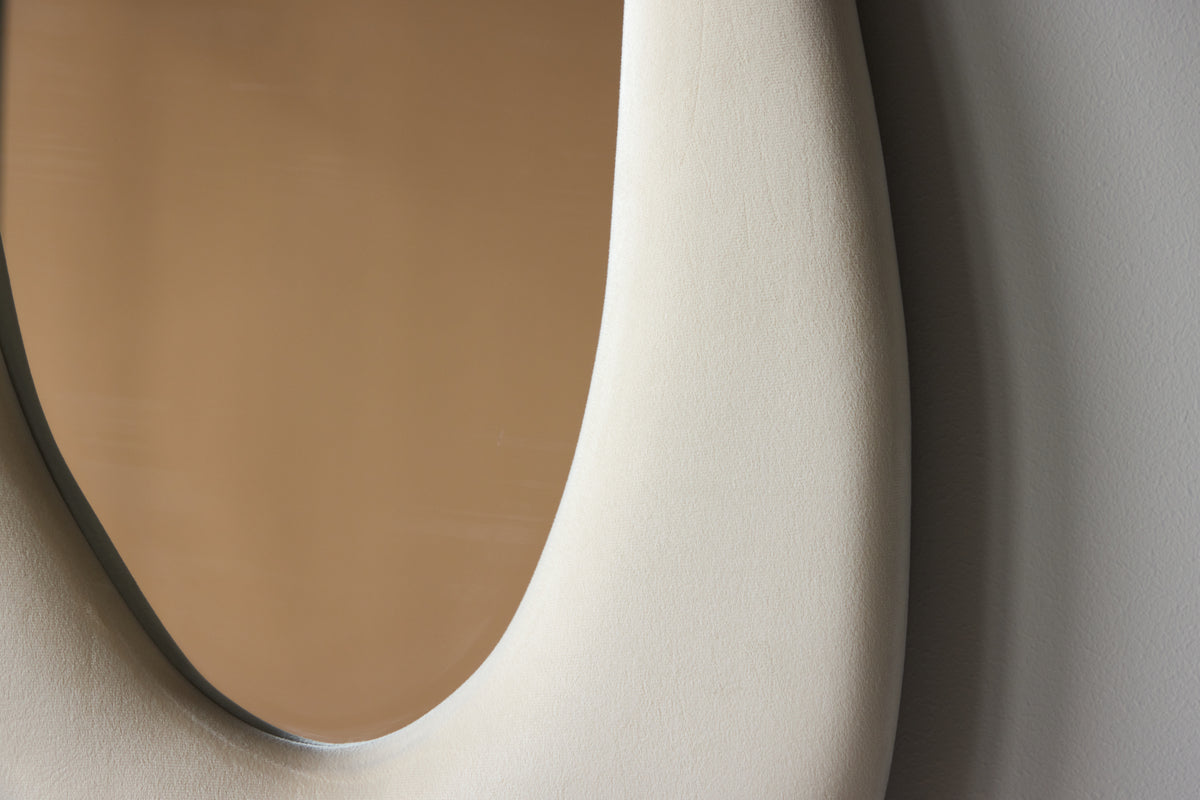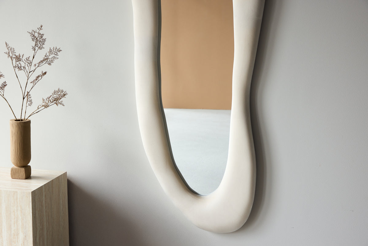 Sig hej til Louisville – et stort gulvspejl, der kombinerer funktion med design på en udtryksfuld måde. Med sin legende form og bløde beige ramme bliver det et dekorativt element i alle slags rum, fra soveværelser og gange til stuer.