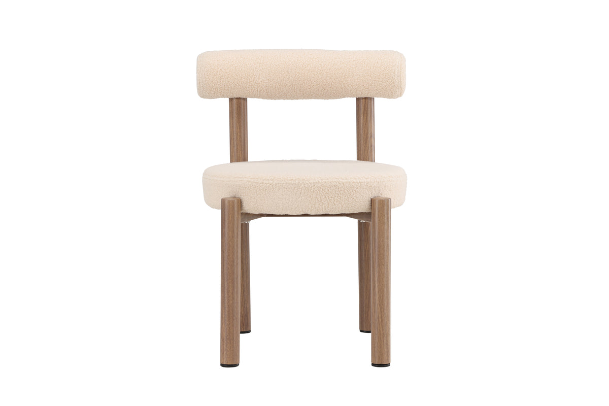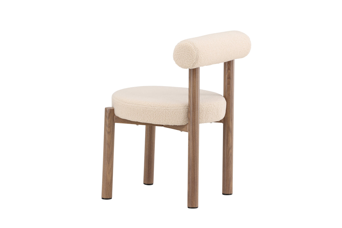Sædet er polstret i hvidt bouclé-stof, der giver en varm og indbydende følelse med sin bløde, teksturerede overflade. Kombinationen af den robuste base og det komfortable sæde gør Tillo til et både stilfuldt og praktisk valg til dit køkken eller spisestue.