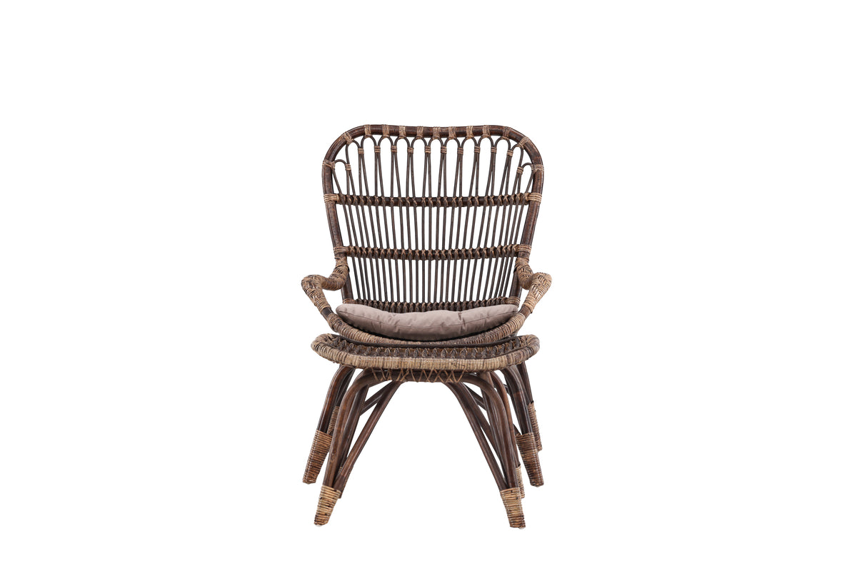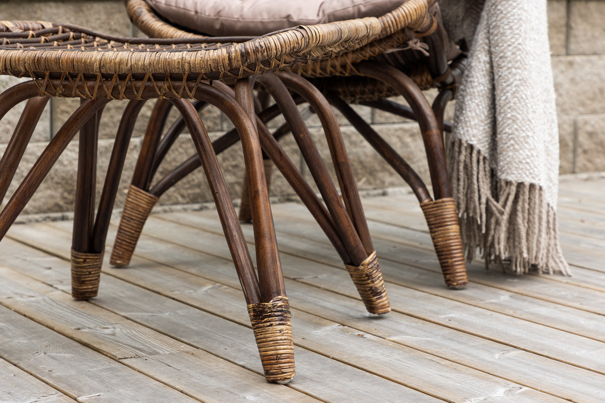 Stolen og fodskamlen er smukt udført i rotting med en dyb mørk valnøddenyanse, hvilket giver et varmt og sofistikeret udtryk. De bløde hynder i en beroligende beige tone skaber en harmonisk kontrast og tilbyder høj komfort i hvert øjeblik.