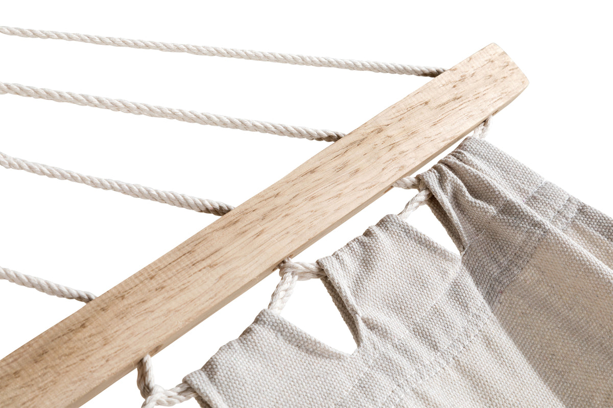Indret din terrasse pompøst med en dejlig hængekøje fra Hedvig serien! Den træramme giver hængekøjen en luksuriøs følelse og klassisk udseende. Den stilfulde polyester måtte i creme-hvid nuance sænker elegance til det samlede indtryk. En hængekøje med alle rettigheder, her får du mulighed for at slappe af og nyde vidunderlige sommerdage i et sundt udendørsmiljø! Plejevejledning: Polyester er snavs- og vandafvisende og kan rengøres ved forsigtig håndvask og dryp tørring. Møbel skum fungerer også godt. Forskellige træsorter kræver forskellig vedligeholdelse. Fælles for alle typer træ er dog at vaske af, lade tørre og slibe chips om nødvendigt. Derefter bør møblet olieres for at give beskyttelse mod fugt og forhindre det i at blive tørt og sprække. Ved oliebehandling bør arbejdet udføres i skygge for ikke at risikere, at olien tørrer for hurtigt, og møblet ikke har tid til at absorbere tilstrækkelig mængde.