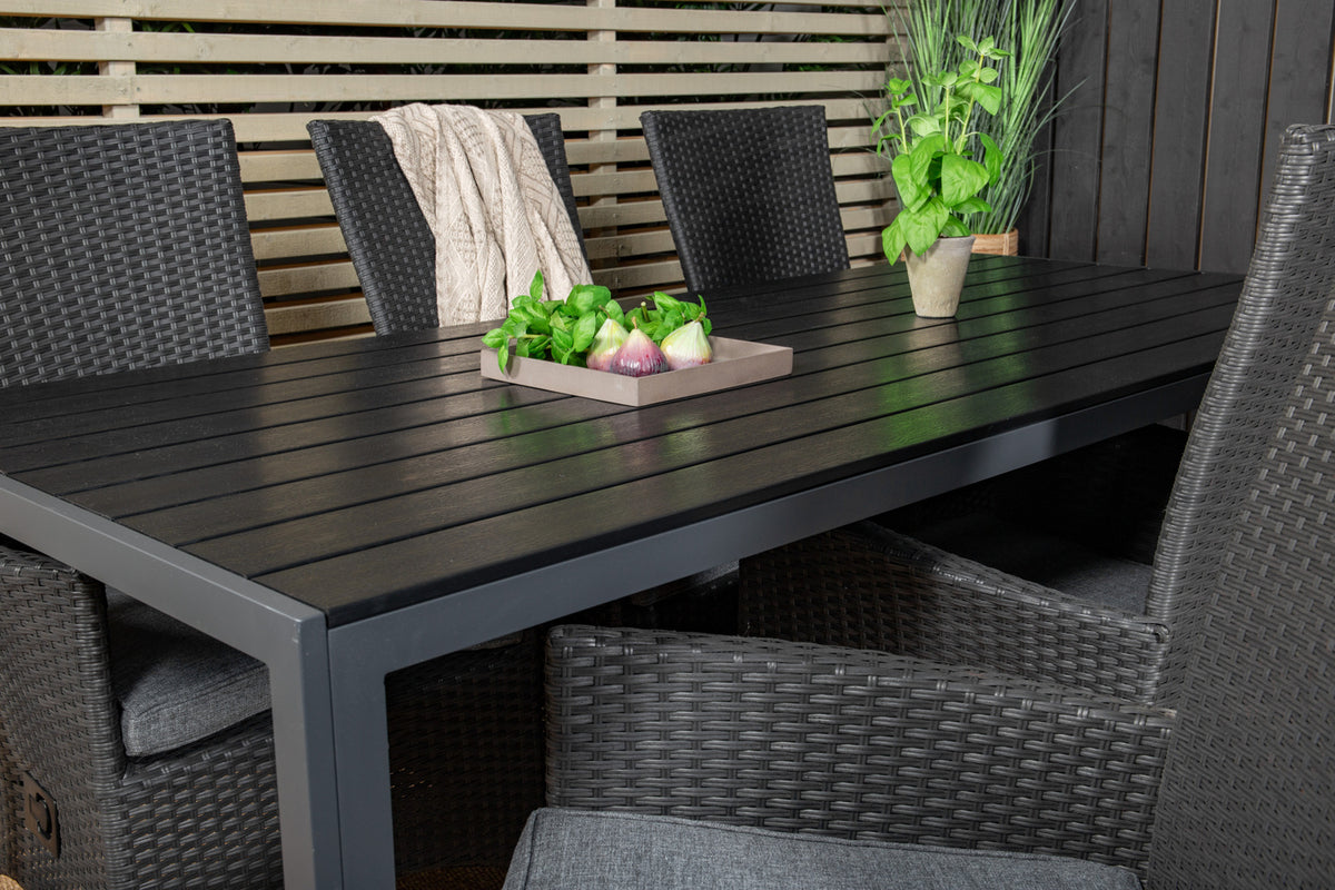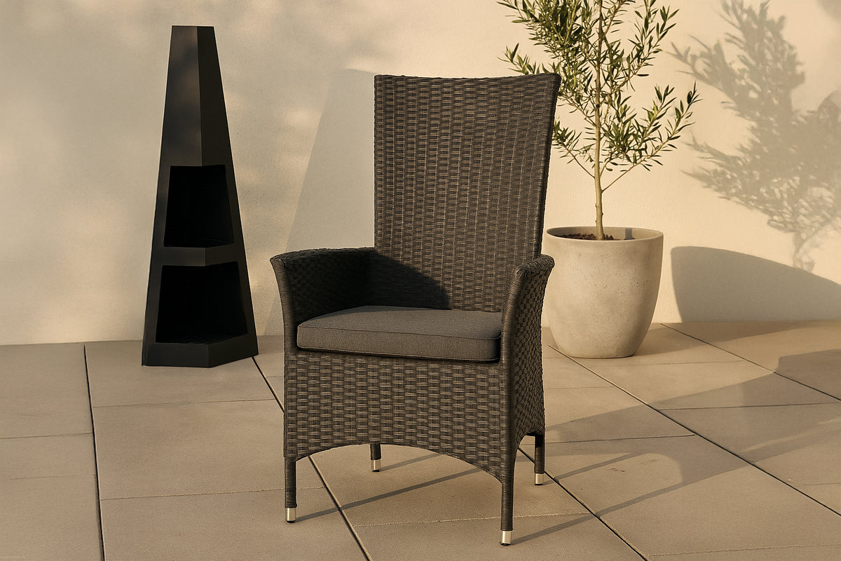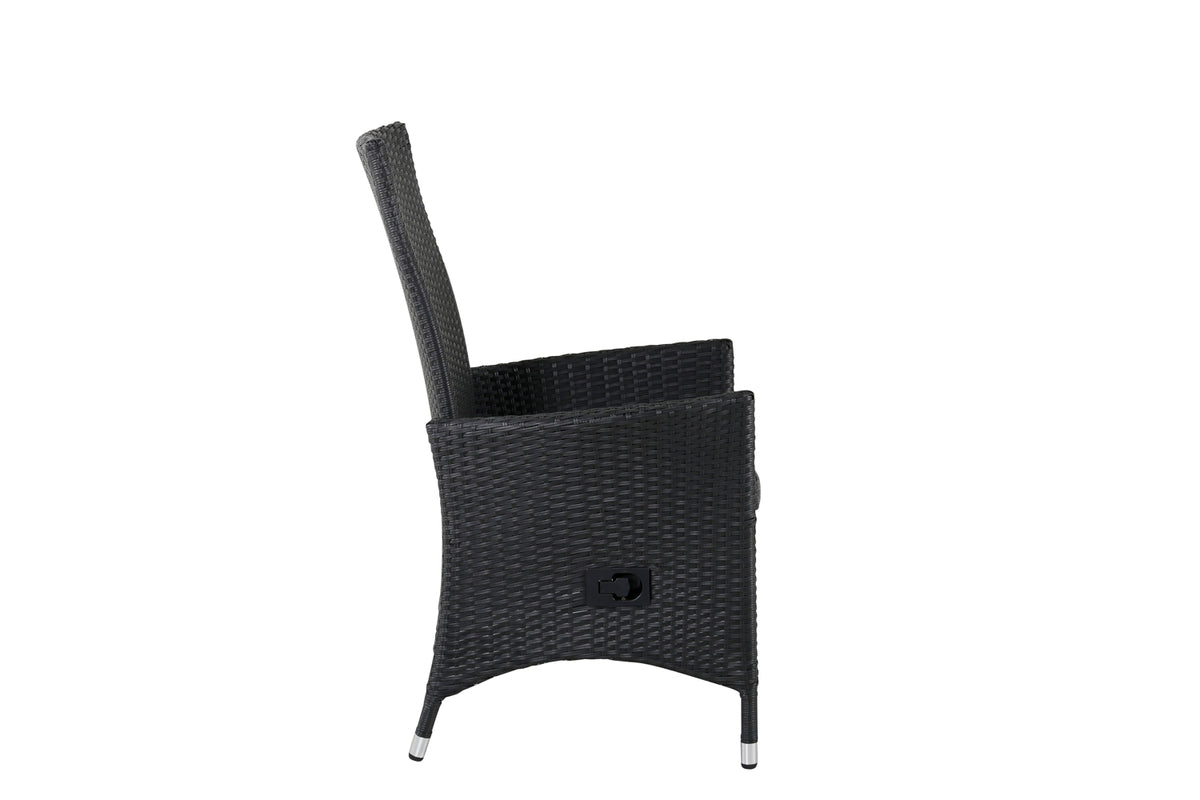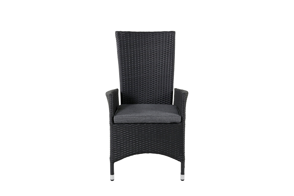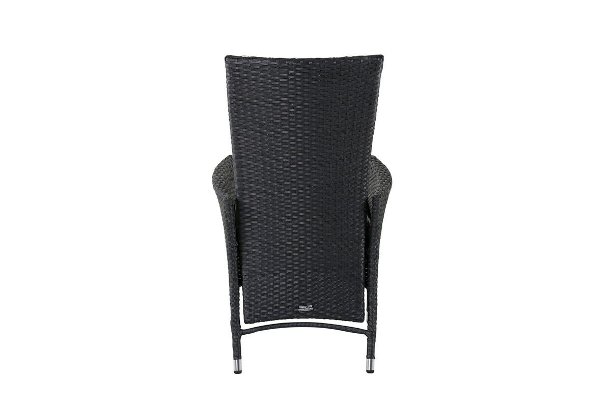 Sid behageligt i sommer i en moderne spisebordsstol med fældbart ryglæn for optimal komfort! Padova kommer i en kæk sort kulør, der er lige så tidløs som stilren. Stellet er i aluminium og stolen i sort polyrattan. Møblér terrassen med en bekvem og robust stol, der holder over tid.