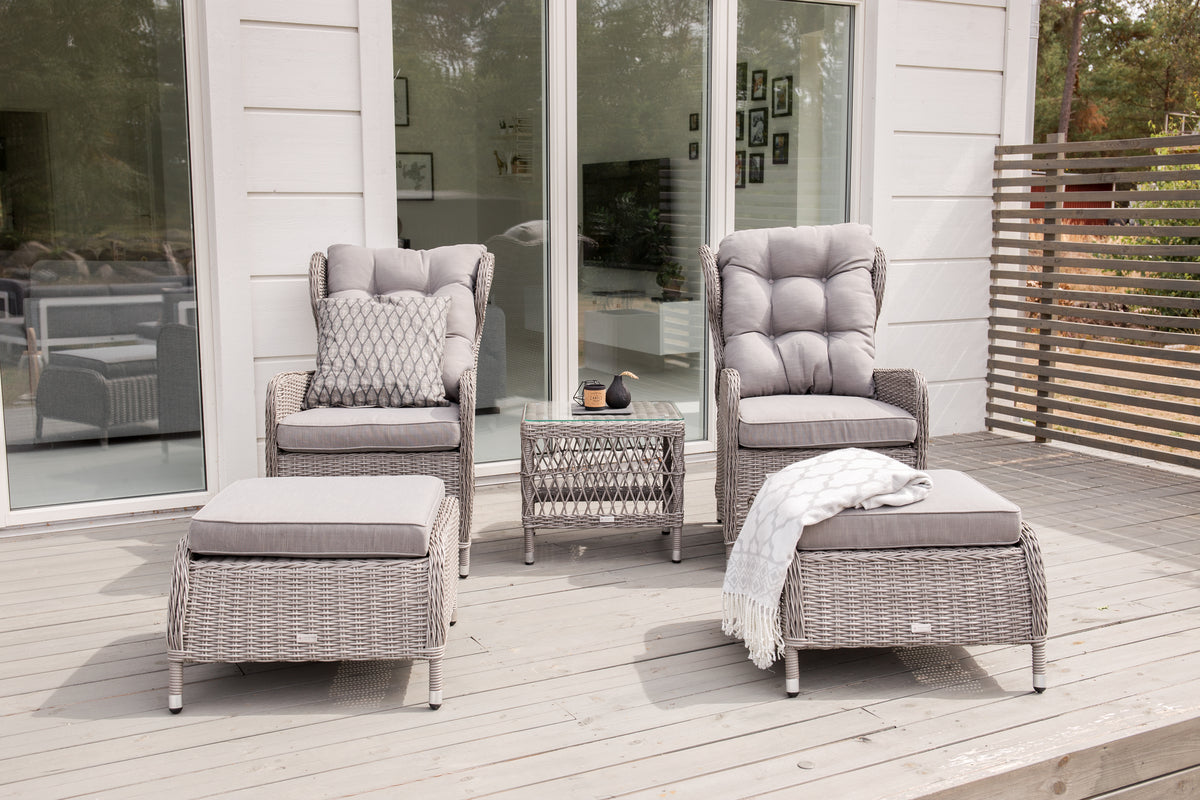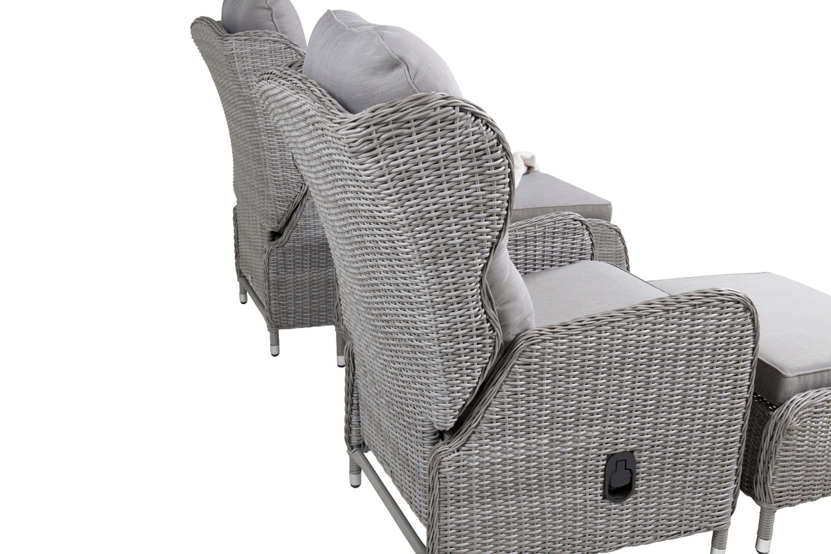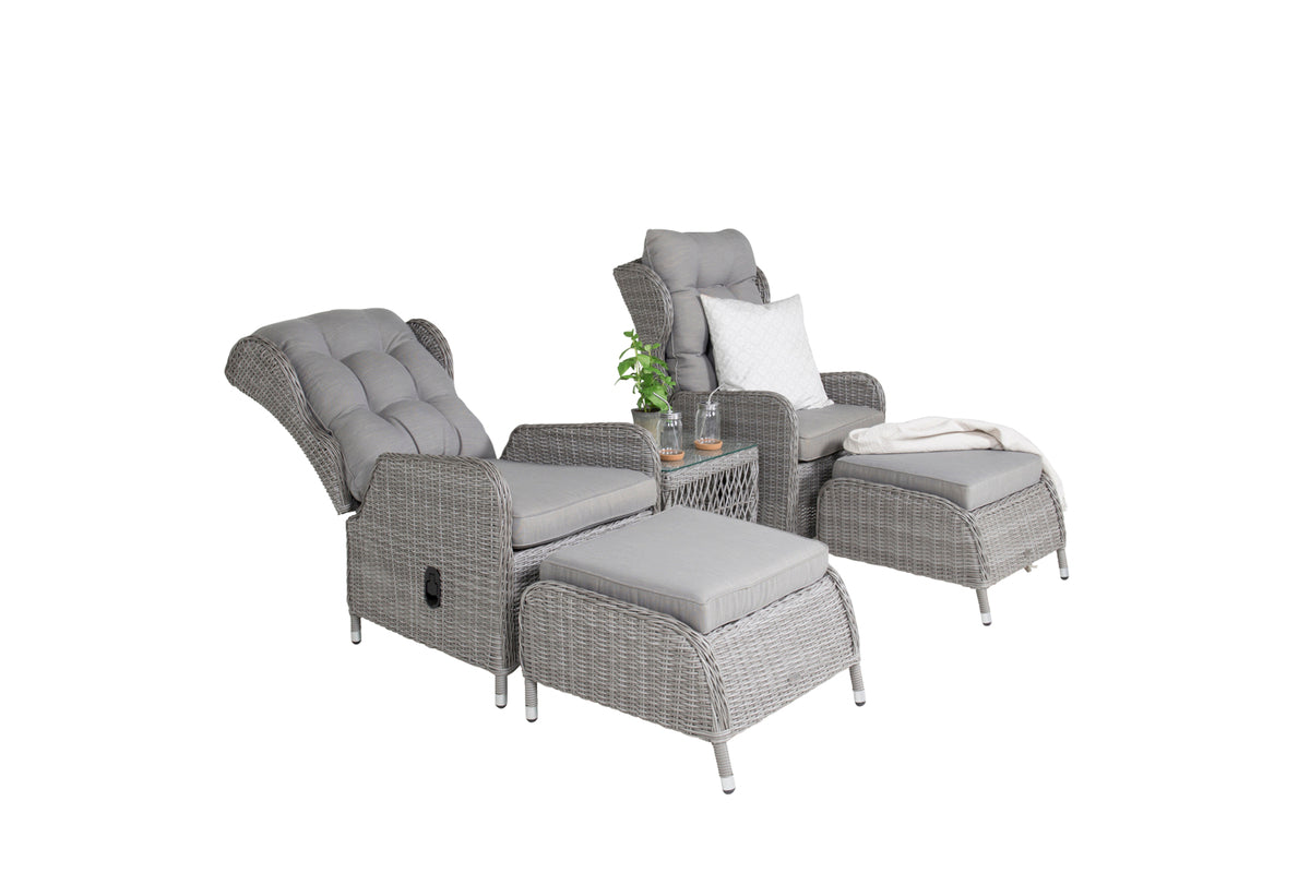 Eksklusivt loungesæt fra serien Washington med en kombination af tidløst design og fantastisk komfort til din terrasse eller altan. Loungesættet består af to reclinerlænestole, to fodskamler inklusive bløde lysegrå pikerede hynder samt et sidebord med en bordplade af glas og fine detaljer i kunstflet, der skaber en helhed. Loungesættet er fremstillet af en aluminiumsramme og lysegrå kunstflet. Nyd sommerbrisen sene sommeraftener i en afslappende lænestol, alene med en god bog eller sammen med en ven!
