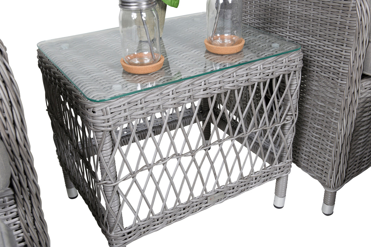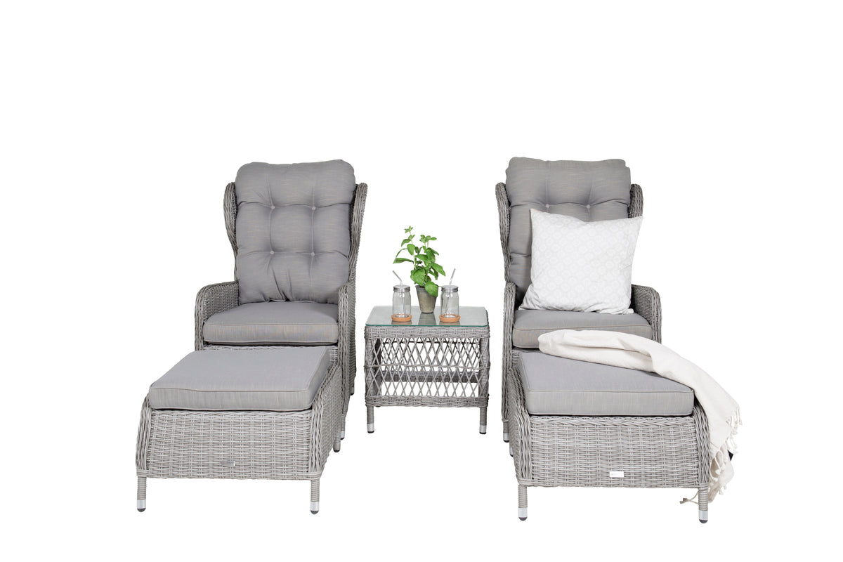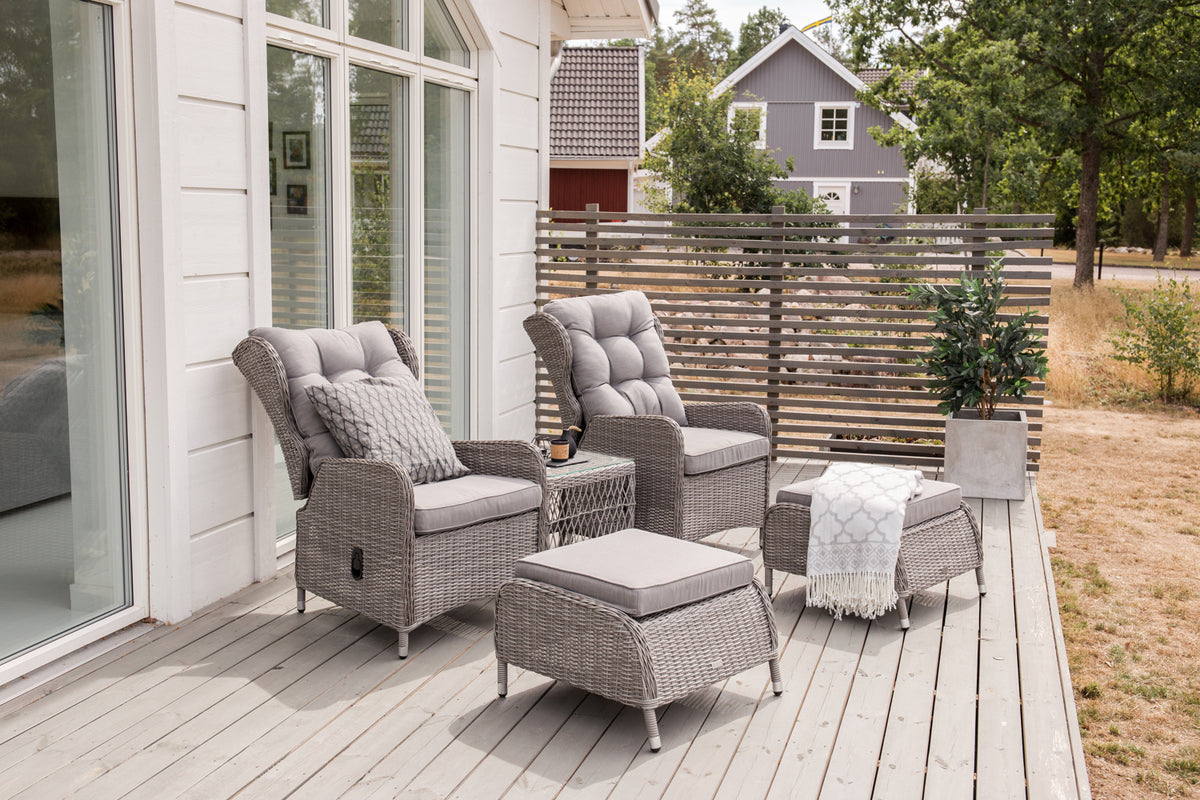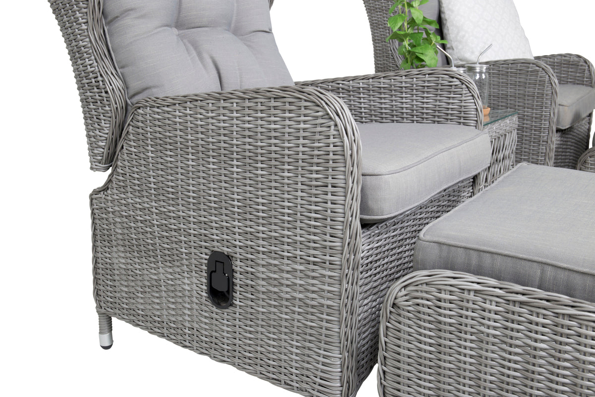 Eksklusivt loungesæt fra serien Washington med en kombination af tidløst design og fantastisk komfort til din terrasse eller altan. Loungesættet består af to reclinerlænestole, to fodskamler inklusive bløde lysegrå pikerede hynder samt et sidebord med en bordplade af glas og fine detaljer i kunstflet, der skaber en helhed. Loungesættet er fremstillet af en aluminiumsramme og lysegrå kunstflet. Nyd sommerbrisen sene sommeraftener i en afslappende lænestol, alene med en god bog eller sammen med en ven!