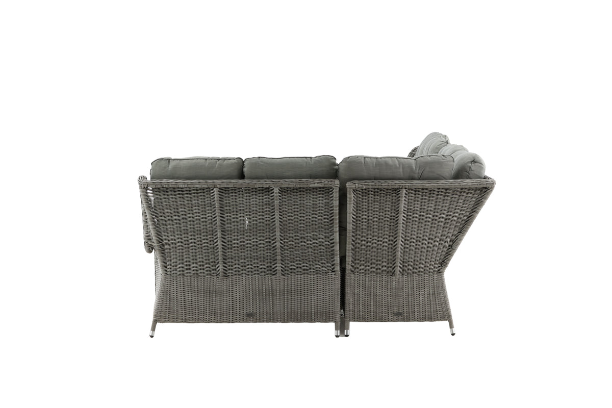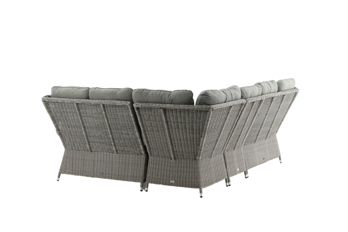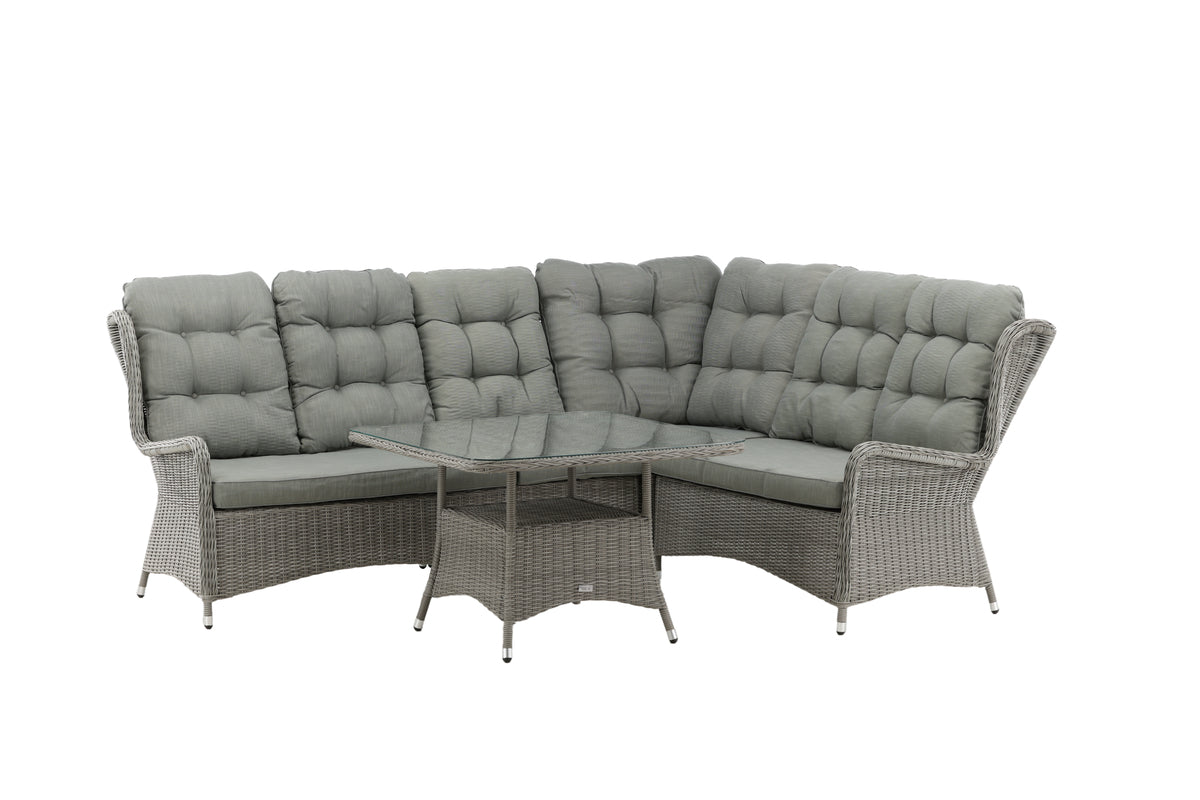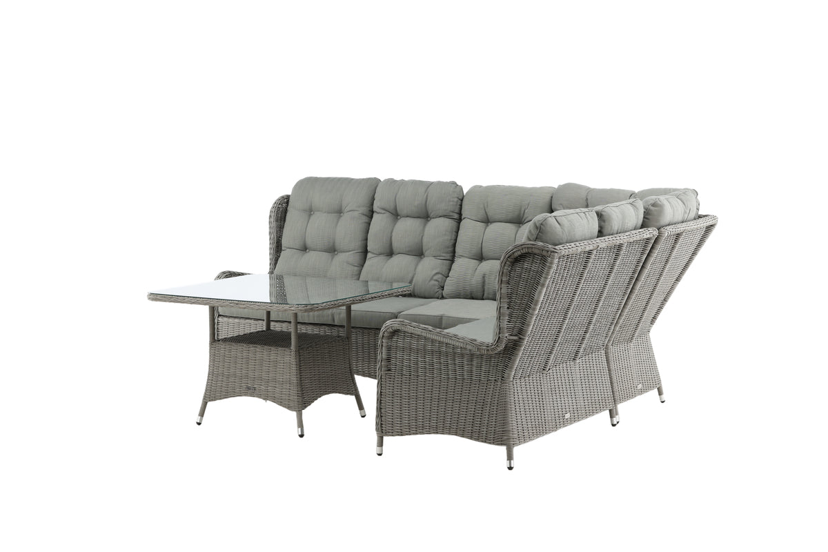 Washington er et eksklusivt loungesæt med en kombination af tidløst design og en fantastisk komfort - den vil garanteret gøre succes på din terrasse eller altan i sommer. Sofagruppen består af en hjørnesofa med 6 siddepladser og en hjørnedel samt et højere sofabord med en aflægningshylde og en bordplade af glas. Fremstillet i lysegrå kunstflet med en aluminiumsramme. Bløde, tykke, lysegrå pikerede hynder medfølger til sofagruppen. Nyd sene sommeraftener på bedste vis!