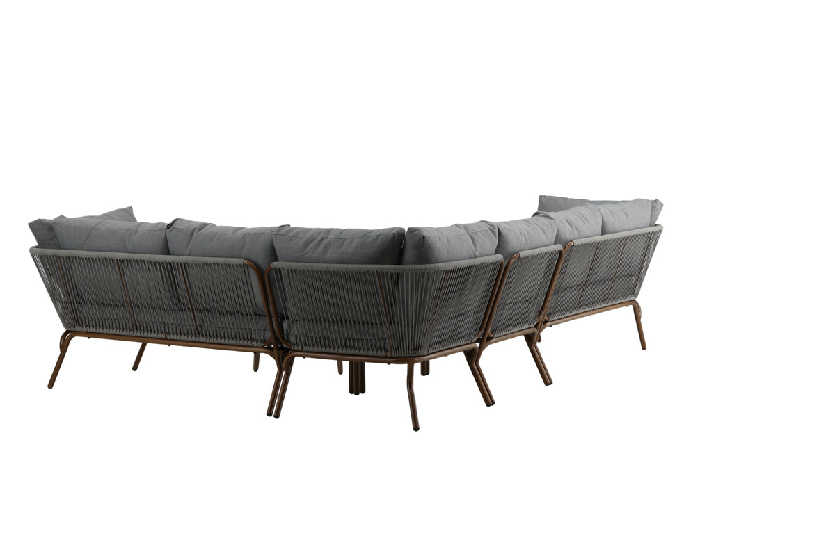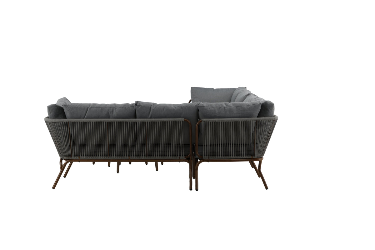 Skab et hyggeligt sted at samle nære og kære omkring til sommer – her sidder I afslappet og komfortabelt i timevis! Roxo er en trendy sofagruppe i stilrent design, der er perfekt til terrassen eller udestuen. Sofagruppen består af en hjørnesofa med 5 siddepladser og en hjørnedel, fremstillet i et slidstærkt design i brun pulverlakeret metal med en ryg, der er designet i lysegråt reb samt stilrene sideborde i tre dele i brunlakeret træ. Grå bløde hynder medfølger til sofagruppen!