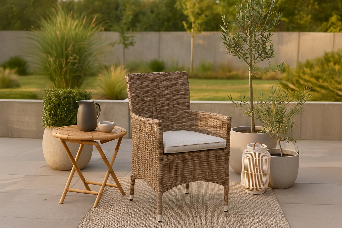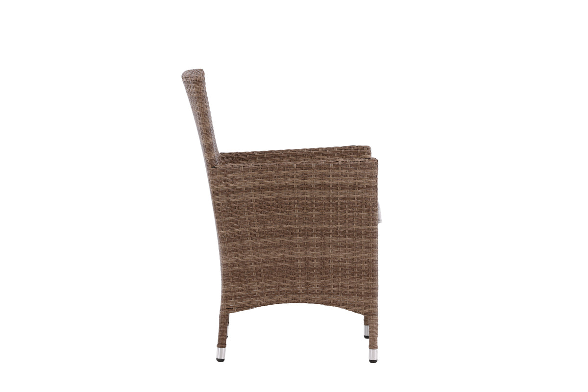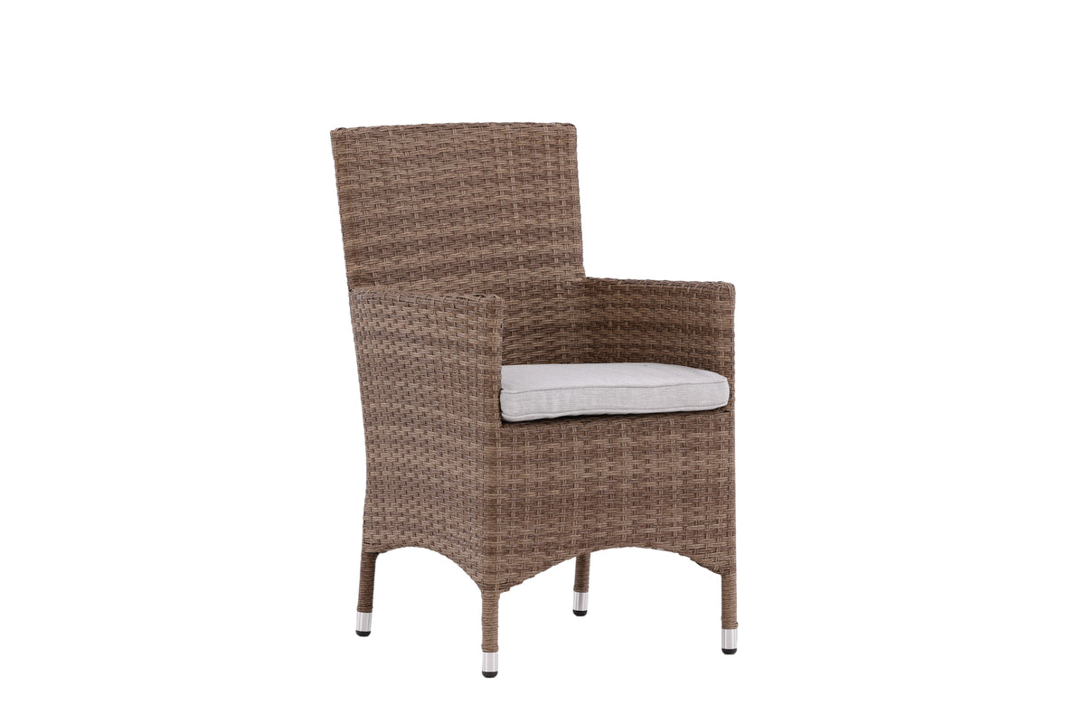 Moderne, stilren og slidstærk – hvad mere kan man ønske sig? I denne lækre armstol fra serien Malin kan du nyde mange middage sammen med dine nære og kære i løbet af sommeren. Med en ramme i jordnær beige aluminium og kunstrådd får du en robust stol, der holder over tid. Sid behageligt i sommer og nyd dejlige måltider udendørs! Stolen er stabelbar.
