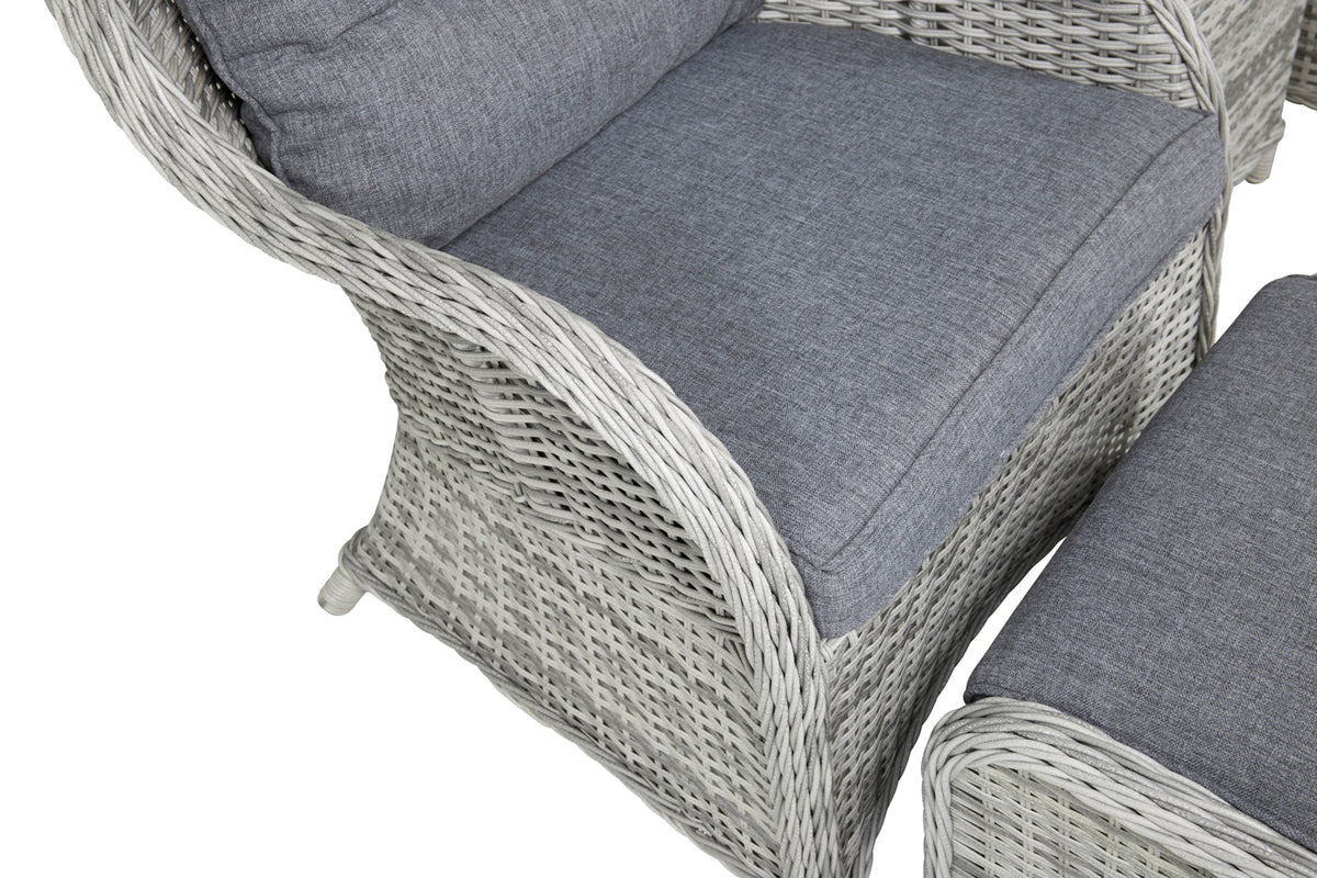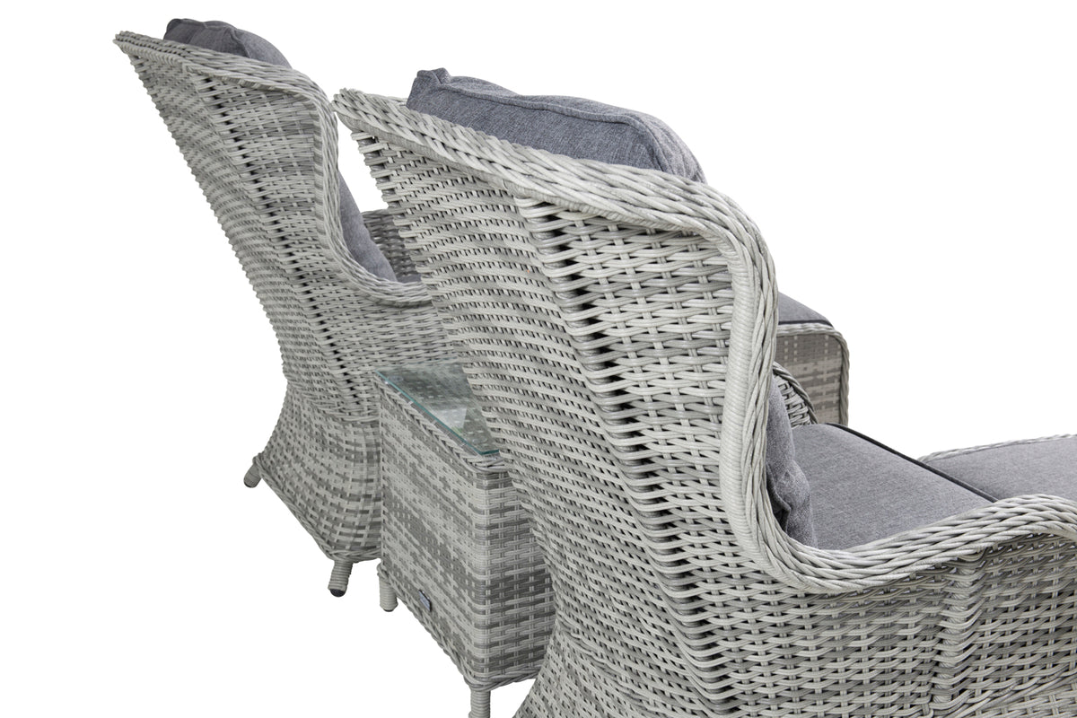 Luksuriøs, komfortabel og hyggelig - den perfekte loungegruppe med eksklusiv følelse! Dette loungesæt fra serien Vikelund kombinerer tidløst design med god komfort til din terrasse. Loungegruppen består af to armstole samt et lavere sofabord med en bordplade af glas. Fremstillet i lysegrå polyrattan med en aluminiumsramme. Inklusive bløde, tykke mørkegrå syede hynder. Møblér terrassen og øg hygge faktoren til sene sommeraftener!