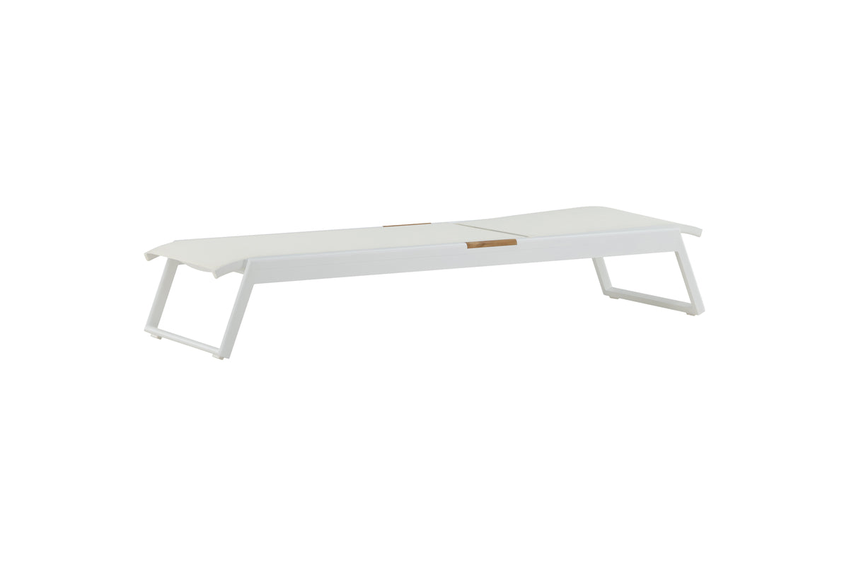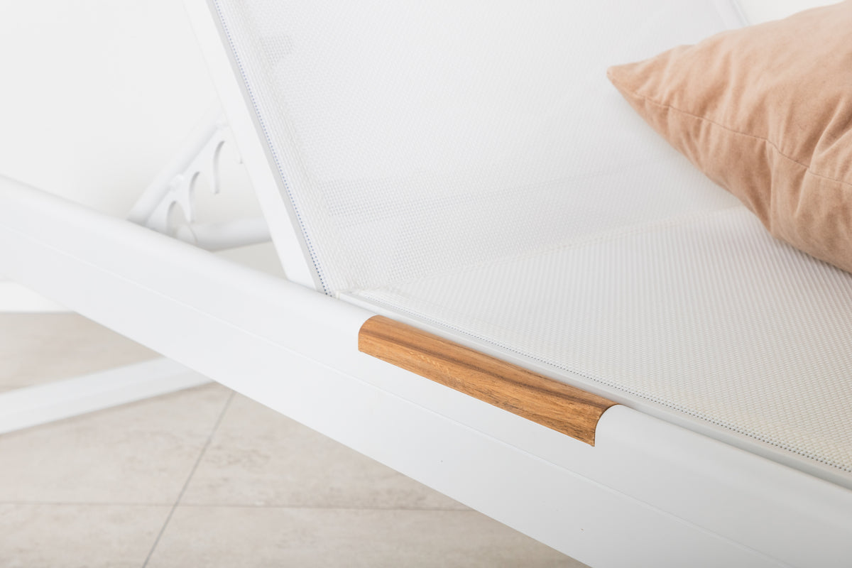 Mexico, en flot hvid solseng med dekorative trædetaljer og klassisk udførelse. Solsengen har et justerbart ryglæn, som gør, at du nemt kan vælge, om du ønsker at sidde op eller ligge ned – juster for den optimale hvileposition. Fremstillet af aluminium og teak er den yderst velegnet til udendørs brug, følg vores vedligeholdelsesråd, så får du en solseng, der holder længe. Nyd solrige sommerdage i en behagelig og iøjnefaldende solseng.