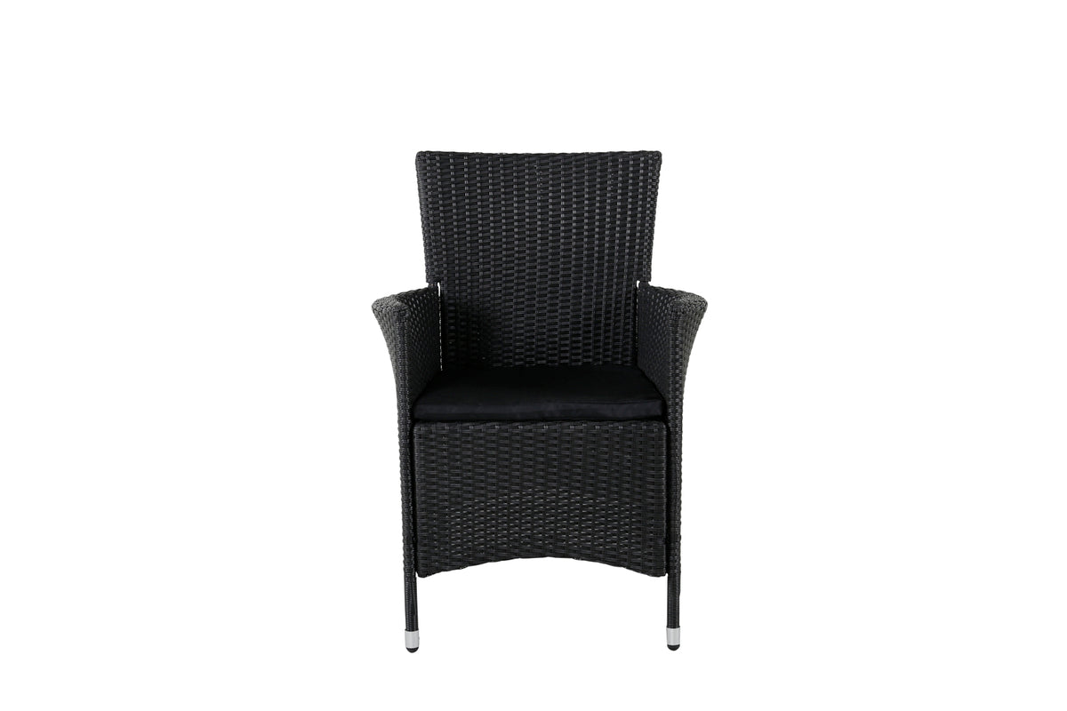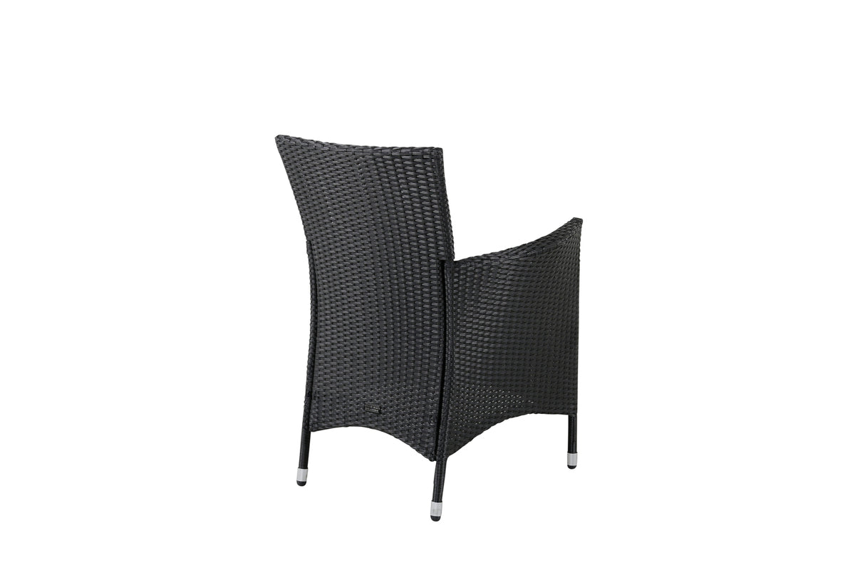 Sid behageligt i sommer i vores trendsikre stole fra serien Knock! En klassisk armstol i sort kunstrattan - enkel at matche og tidløs kulør. Her tilbydes du virkelig en robust stol, som du sidder behageligt i flere timer. Forlæng middagsinvitationerne og nyd varme aftener sammen med venner i en hyggelig madgruppe, kompletér stolen til noget af vores flotte spisebord til udendørs brug. Stolen er stabelbar.