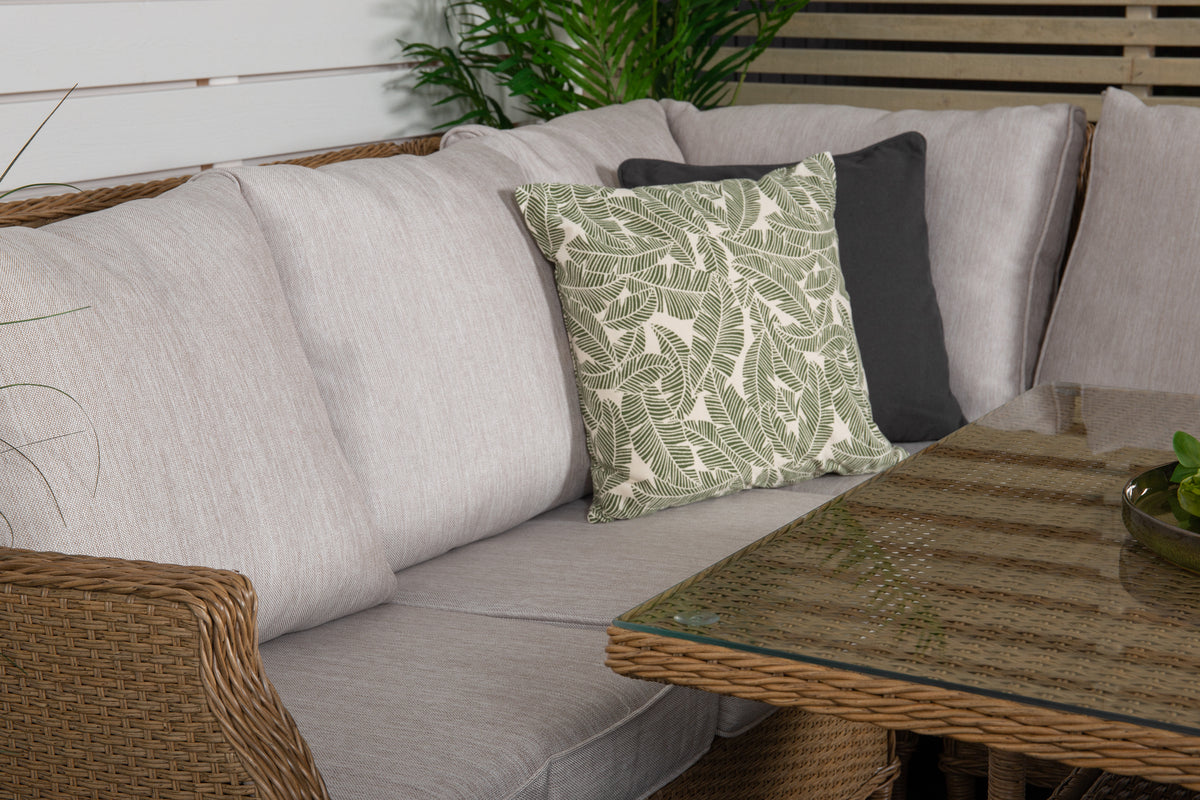 Sofagruppe Vikelund i klassisk design med fokus på god komfort til din terrasse eller altan. Sofagruppen består af en hjørnesofa med fire siddepladser og en hjørnedel. Til sofaen kommer sandfarvede bløde hynder samt et højere sofabord med en aflægningshylde og en stilren bordplade af glas. Sofagruppen er fremstillet af en metalramme og naturfarvet kunstrotting - lige så praktisk som holdbart!