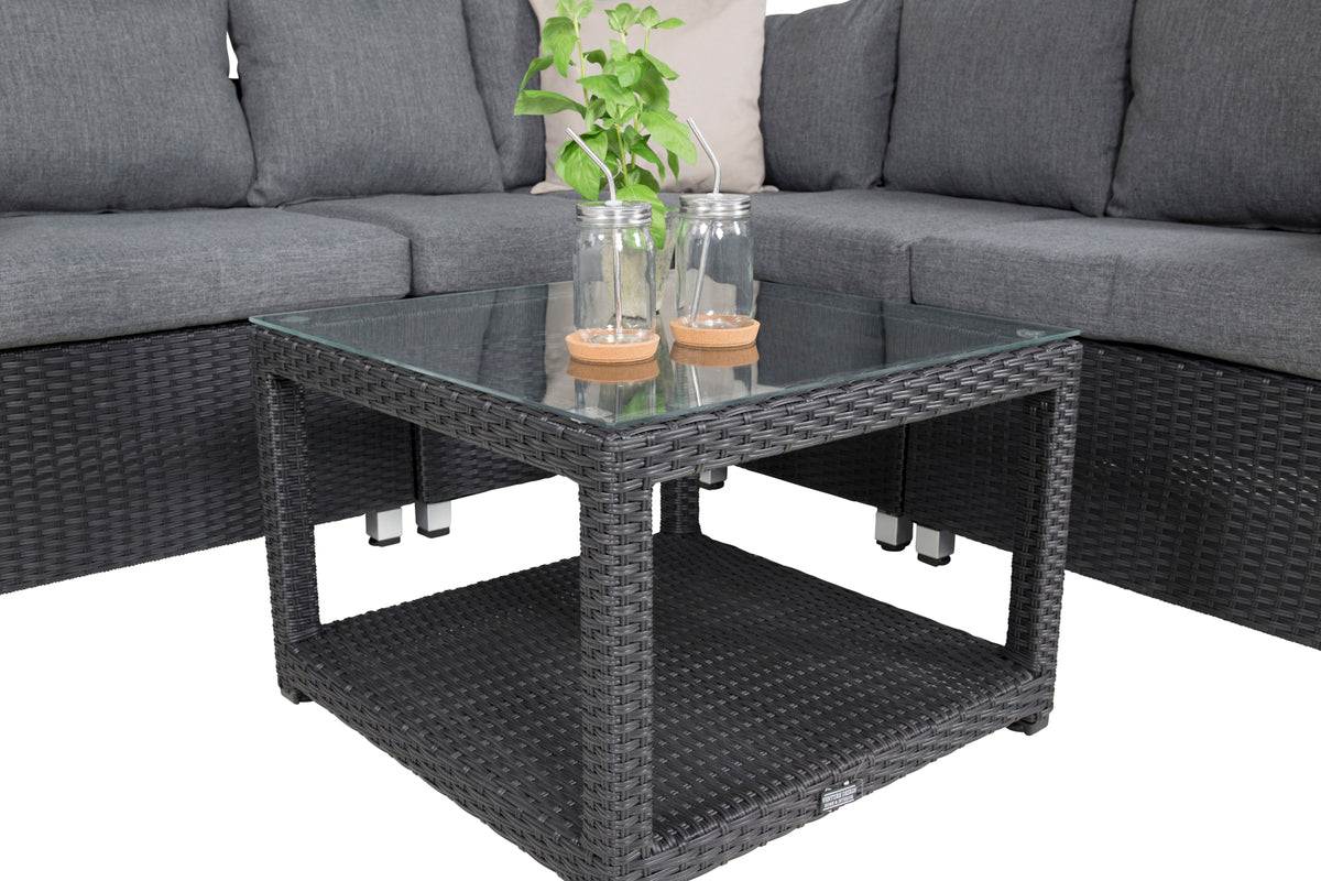 Sofagruppe i moderne design til din terrasse eller altan. Sofagruppen består af en hjørnesofa i modulform med fire siddepladser og en hjørnedel, som er let at bygge sammen for at passe til dine behov. Inklusive mørkegrå bløde hynder samt et lavere sofabord med en aflægningshylde og en bordplade af glas. Fremstillet af en metalramme og sort kunstrådd.