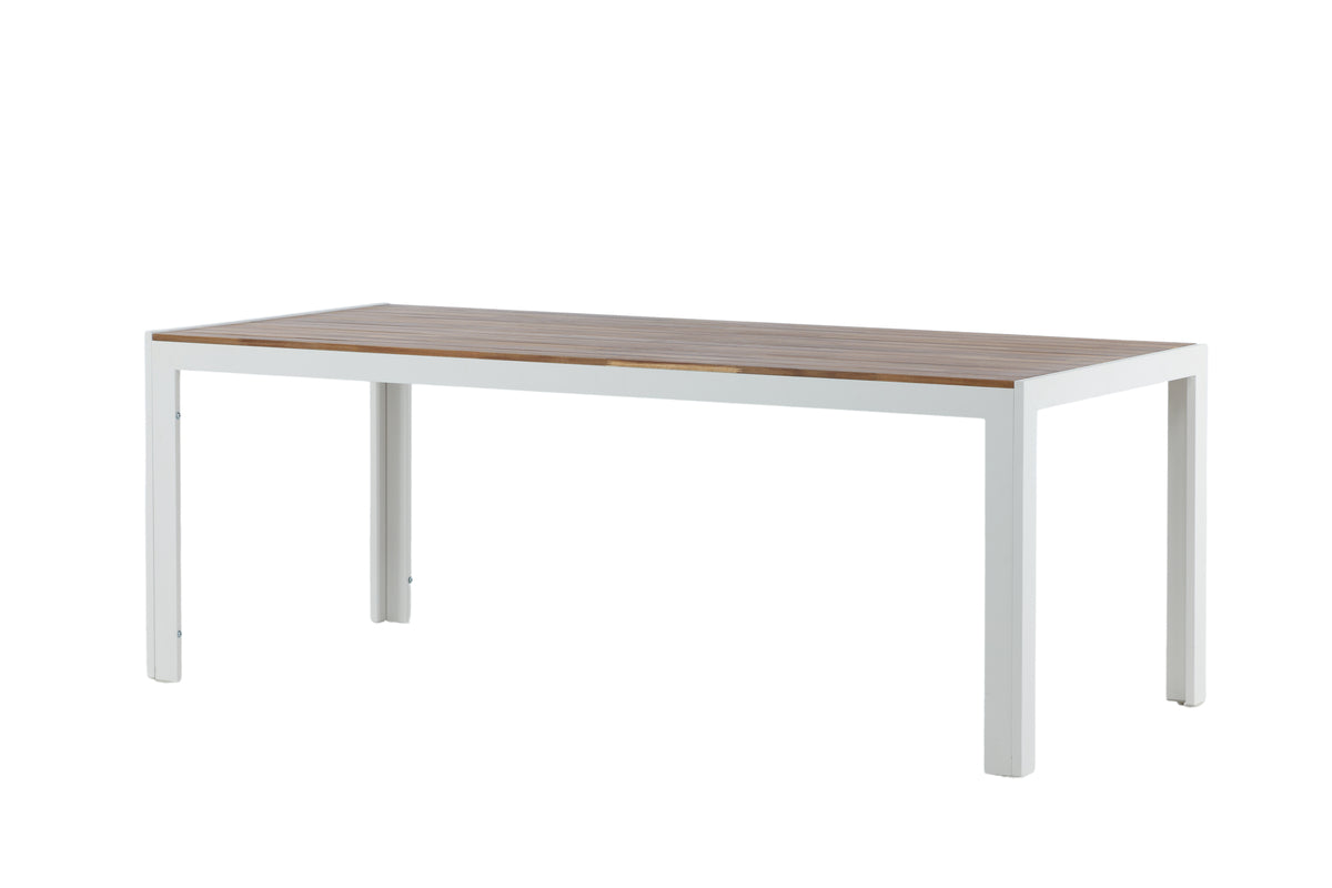 Spisebord Bois imponerer med sine lige nordiske former og klassiske design! Bordpladen er i dekorativt akacietræ og bordbenene i stilrent hvidt metal. Match med et par lækre spisebordsstole, så får du en komplet spisegruppe at samle venner og familie omkring – gør jer klar til måltider udendørs og nyd hyggeligt selskab i sommer!