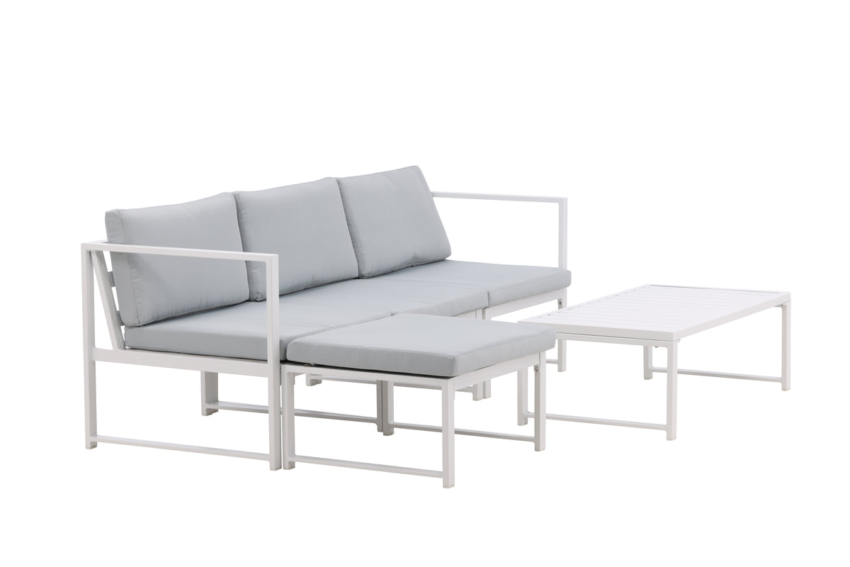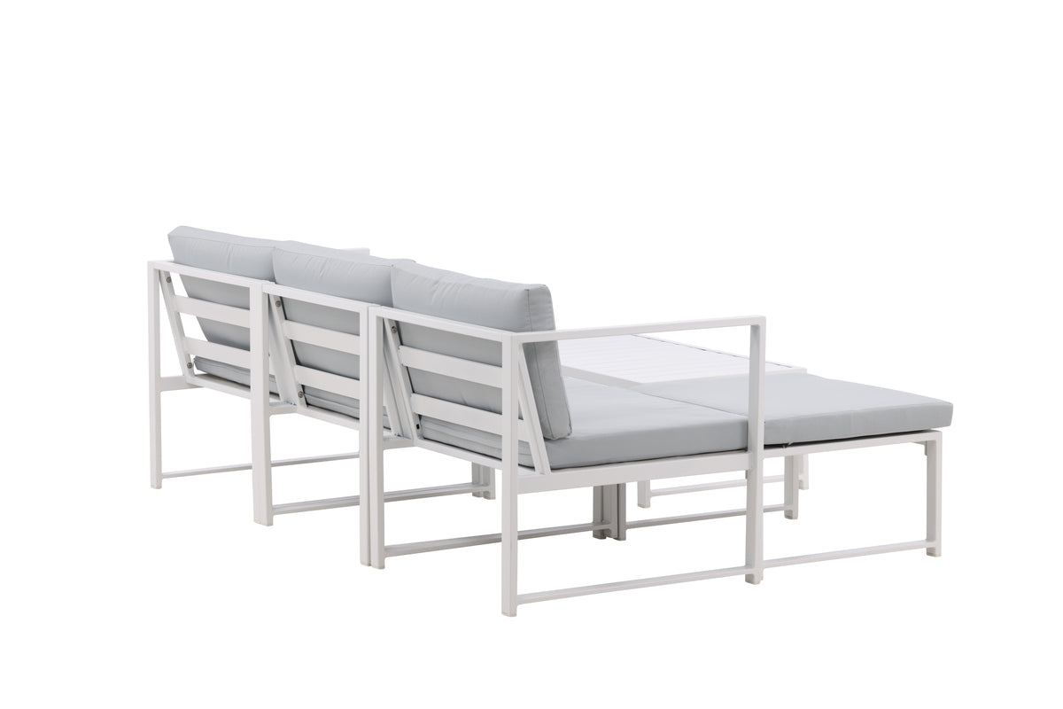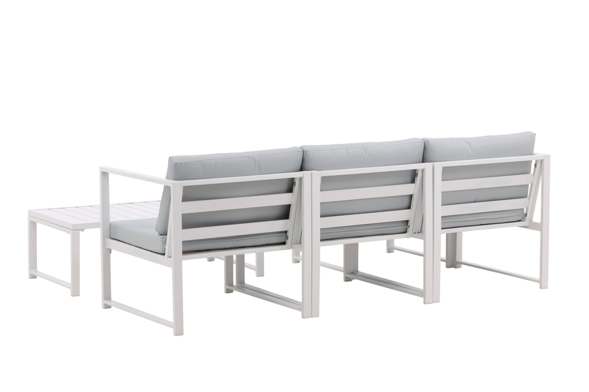 Salvador er en stilren sofagruppe i en behagelig grå farve, der imponerer med sit gennemtænkte helhedsdesign. Sofagruppen består af en trepersoners sofa med chaiselong samt et sofabord. Fremstillet i hvidt pulverlakeret metal og aluminium - let at vedligeholde og holdbart til udendørs brug! Bløde lysegrå hynder er inkluderet til sofagruppen. Sofaen er opbygget af moduler, som gør, at den kan tilpasses præcis, som du vil have den, perfekt til at skabe din egen charmerende oase på terrassen!
