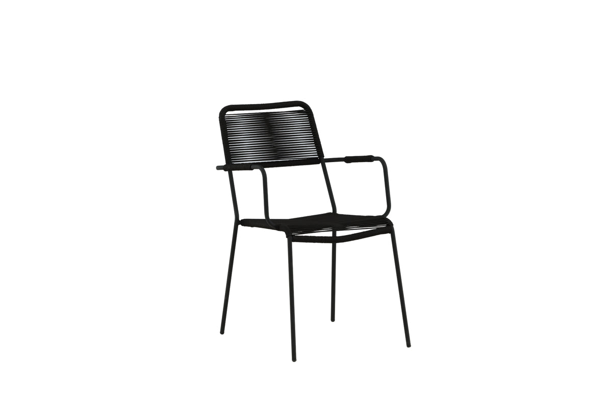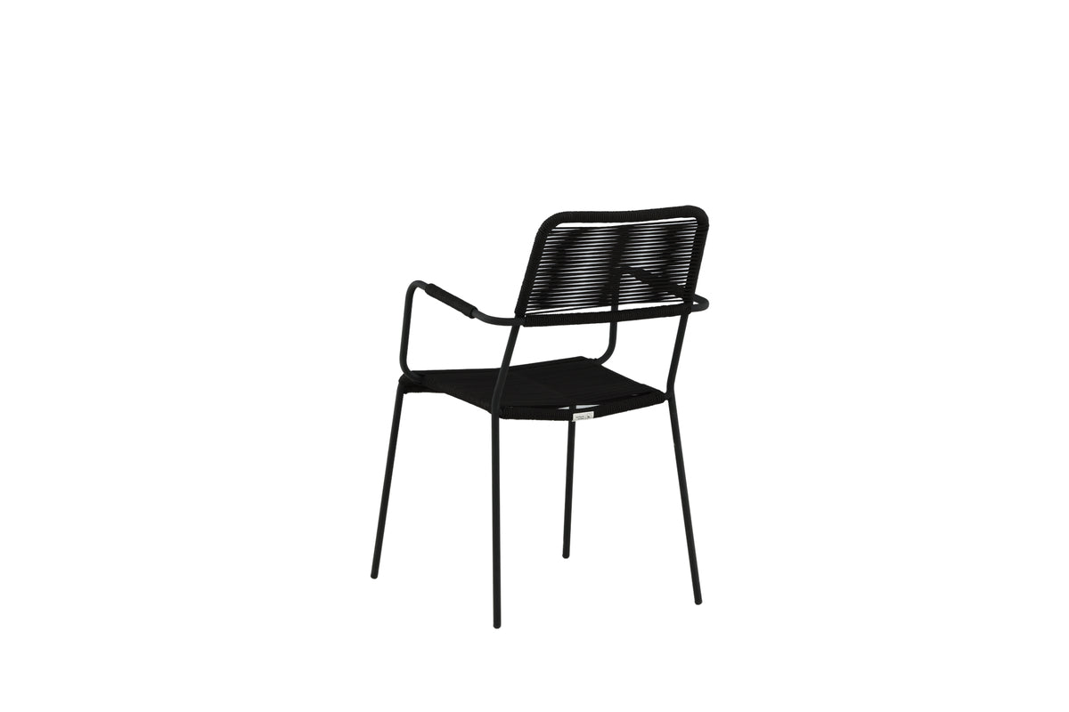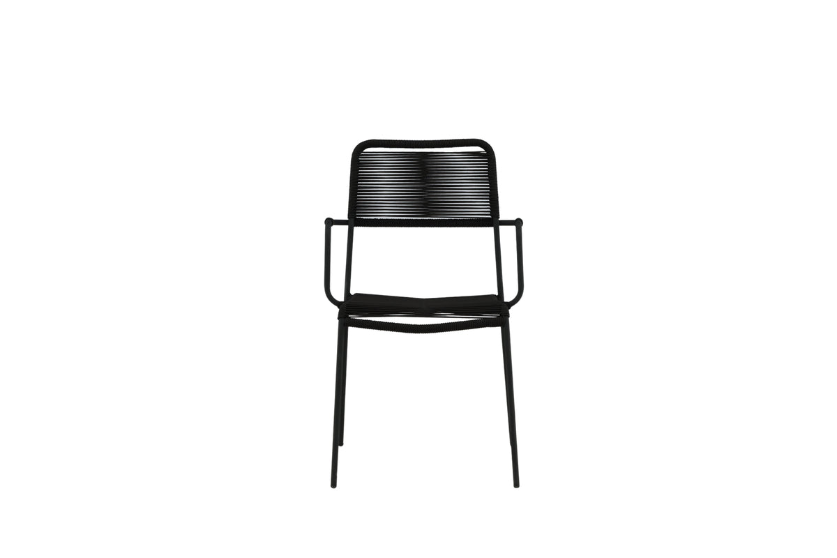 Møbler terrassen moderne med elegante spisebordsstole fra serien Lindos. Armlænene er fremstillet i sort aluminiumskonstruktion og sædet i sort vævet reb. Lindos er en rigtig designikon, der passer både i klassiske og moderne miljøer. Invitér til mange sociale stunder fremover! Stolen er stabelbar.