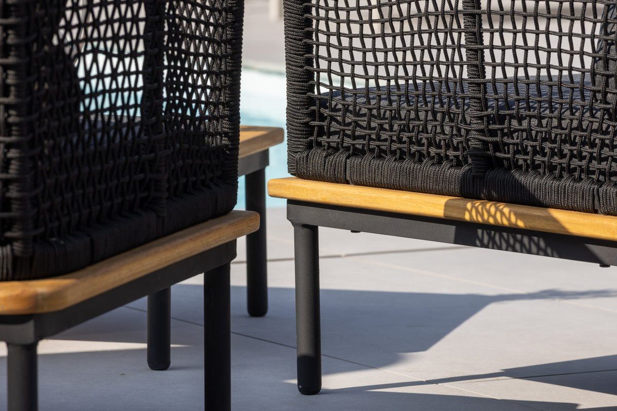 En nydelig stilren sofagruppe i moderne design fra serien Andorra. Sofagruppen består af en topersonerssofa og to lænestole fremstillet i en sort pulverlakeret metalramme med stilfulde detaljer i akacie og en ryg i sort reb, inklusive bløde tykke mørkegrå hynder. Et lavt sofabord med en bordplade i akacie og et understel i samme udførelse som sofaen, tilsammen skaber de en stilfuld helhed.