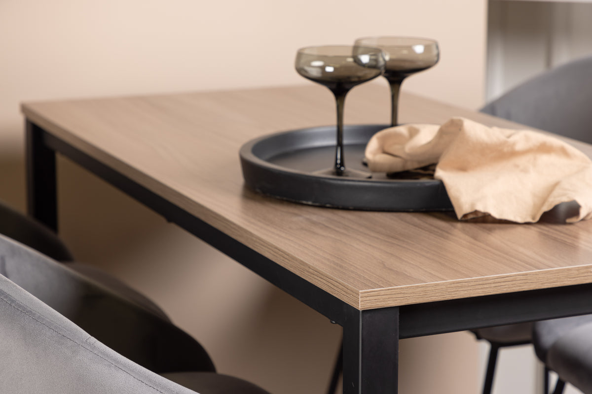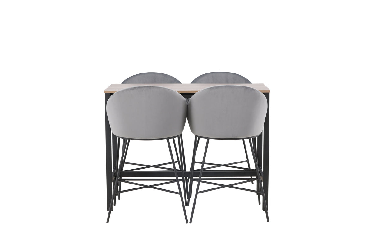 Her får du en trendy, komfortabel og stilsikker bargruppe, der skaber et indbydende indtryk i rummet. Bargruppen har plads til 4 og består af et barbord fra serien Camden og stole fra serien Velvet. Barbordet har lige nordiske former og et klassisk design, der holder over tid, med en valnøddefarvet bordplade i MDF og lige bordben i sort stål med en ramme til fodstøtte for ekstra komfort. Stolen har et fuldpolstret design med let afrundet ryg og sæde i blødt velourstof og minimalistiske ben i sort pulverlakeret metal. Indret spisepladsen med denne flotte bargruppe og nyd hyggelige og komfortable middage med nære og kære.