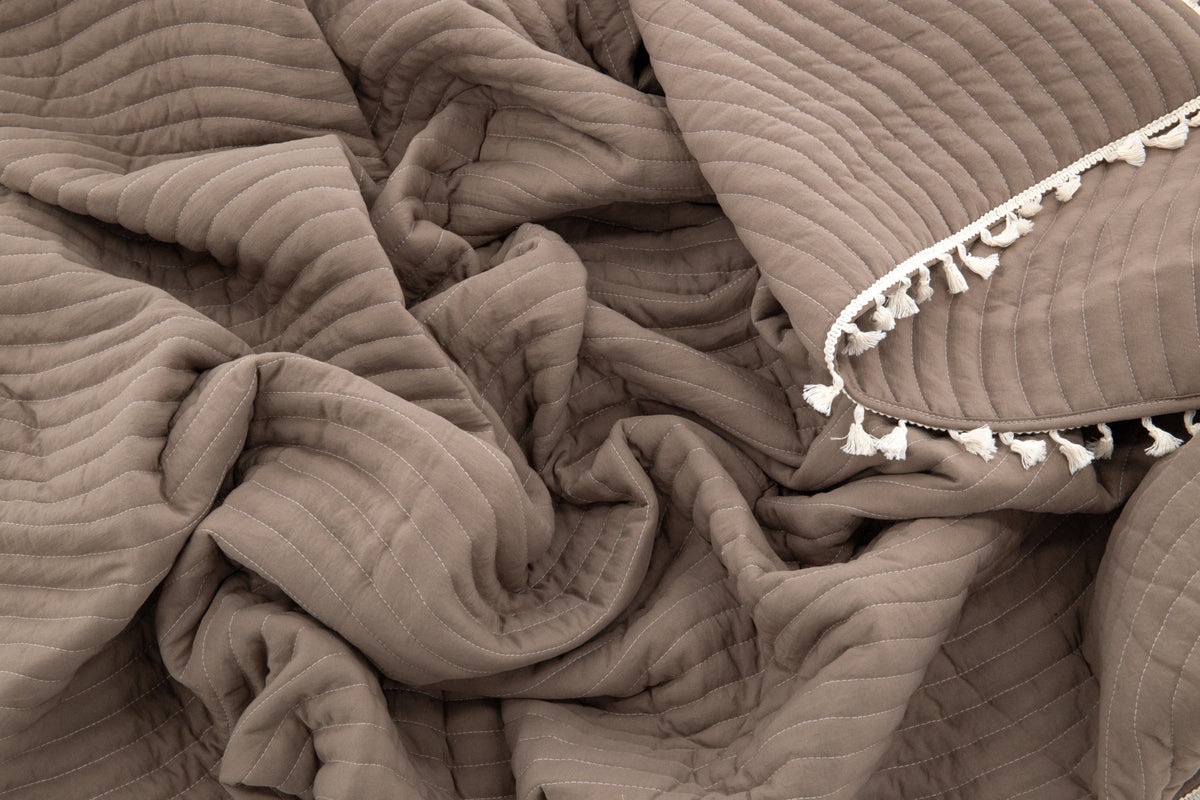 Lias-sengespreder i blød mikrofiber giver en varm følelse i soveværelset, og den brune farve giver et hyggeligt og ombonet indtryk. Lias er et quiltet sengetæppe og har en dekorativ broderet kant med frynser, som giver en fin effekt til din opredning. Vi anbefaler at bruge pletfjerner ved eventuelle pletter og lufte tekstilen ofte for at bevare farve og form. Sengesprederen er 260x260cm, og vi anbefaler at vaske i maskinvask 40 grader.
