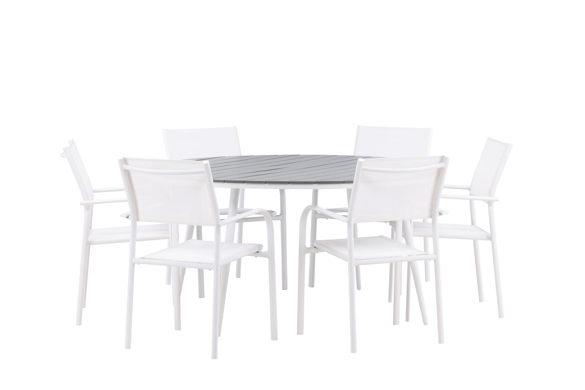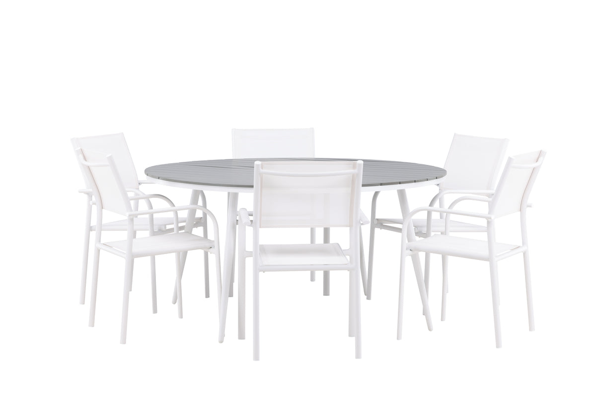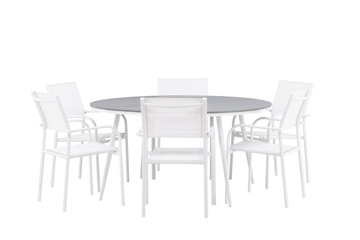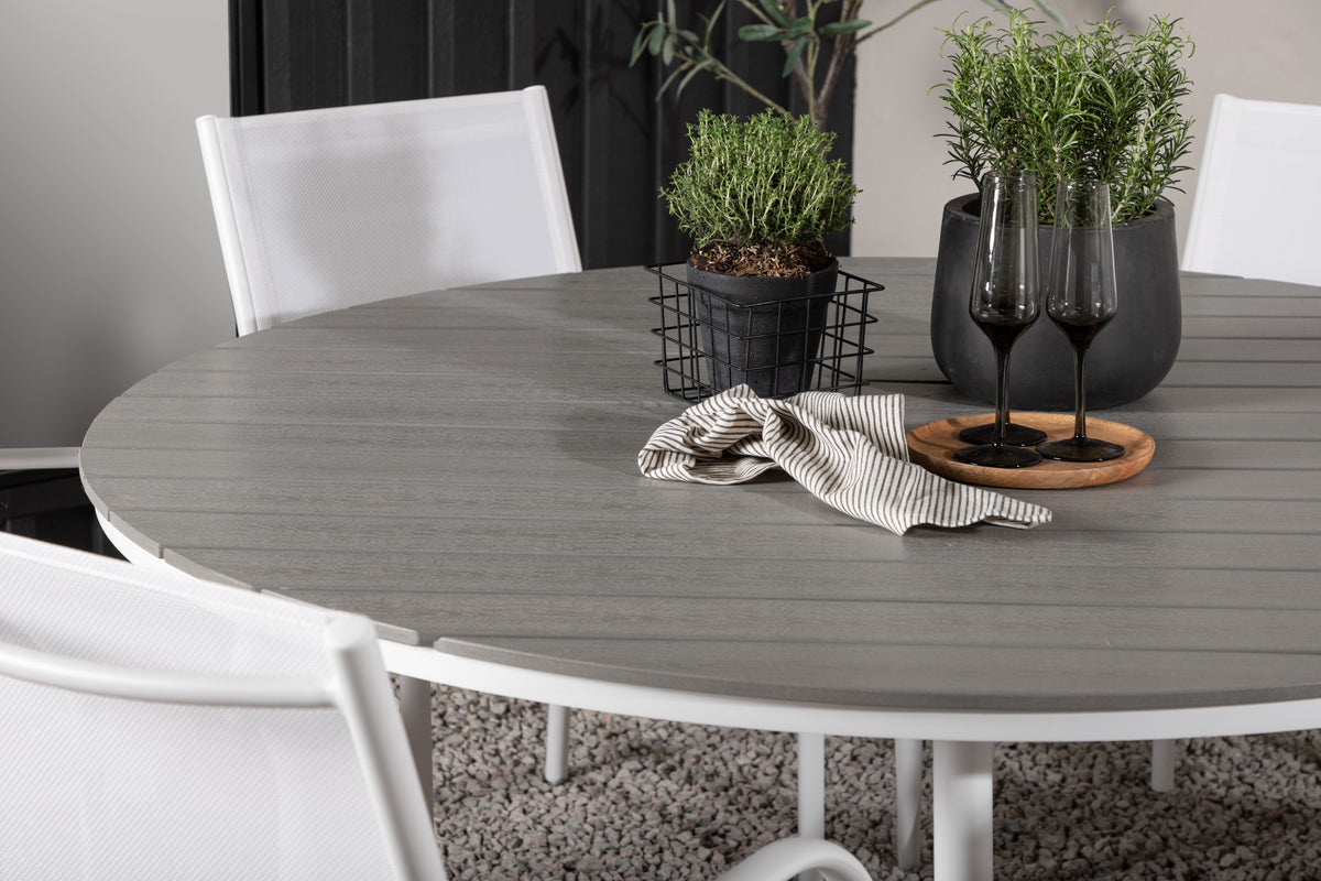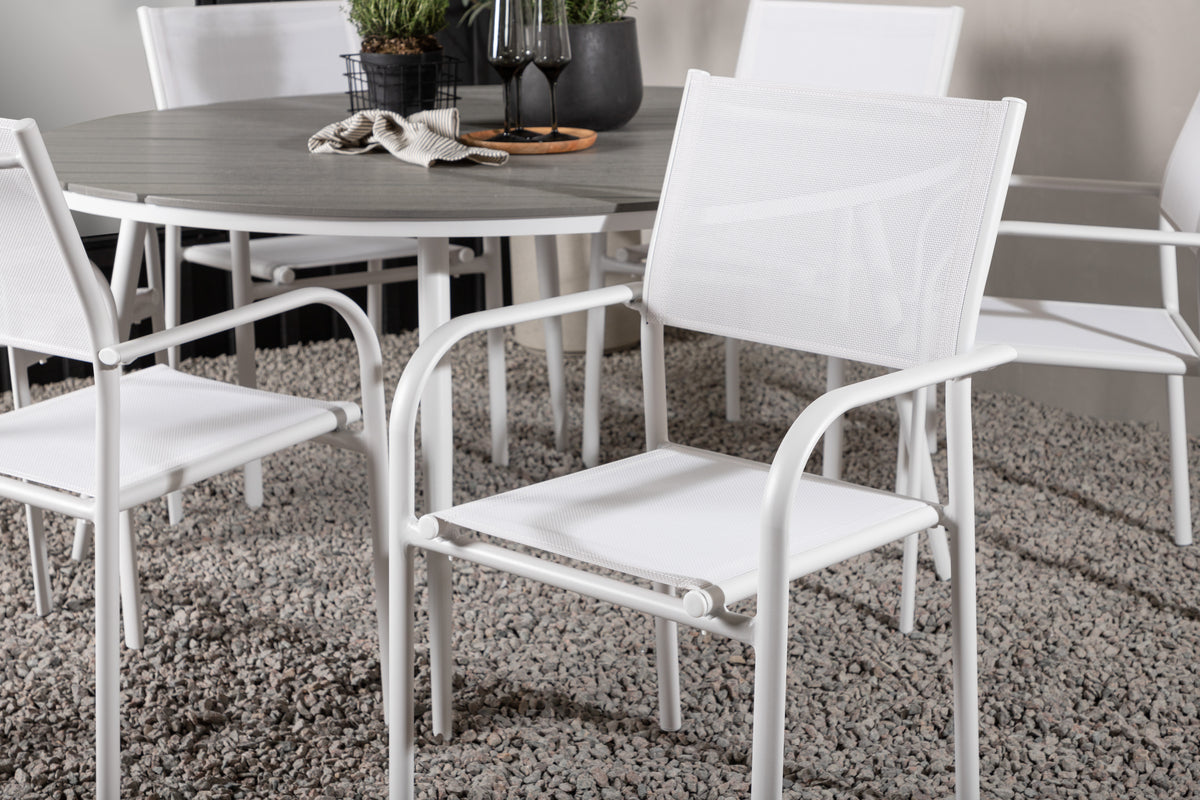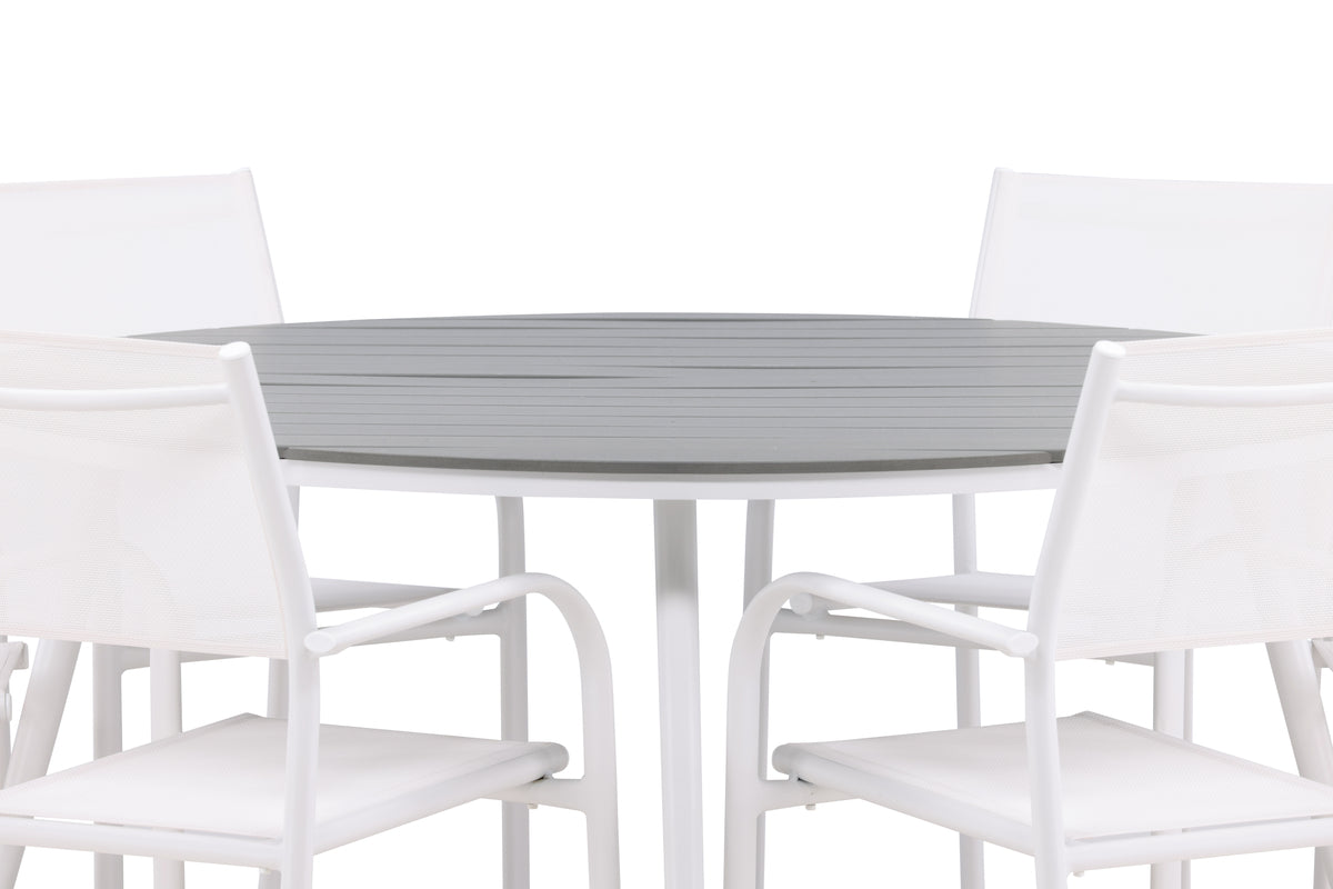 Her er der plads til alle, og ingen risikerer at havne på kanten - en rund spisegruppe er perfekt til hyggelige, sociale stunder! Spisebord Break har en rund bordplade i grå aintwood og et klassisk understel i hvid aluminium. Her i perfekt kombination med sorte spisebordsstole fra serien Santorini. Stolene har lige nordiske former med integrerede armlæn i aluminium og et sæde i sort textilene. Lad tiden her blive dagens højdepunkt!