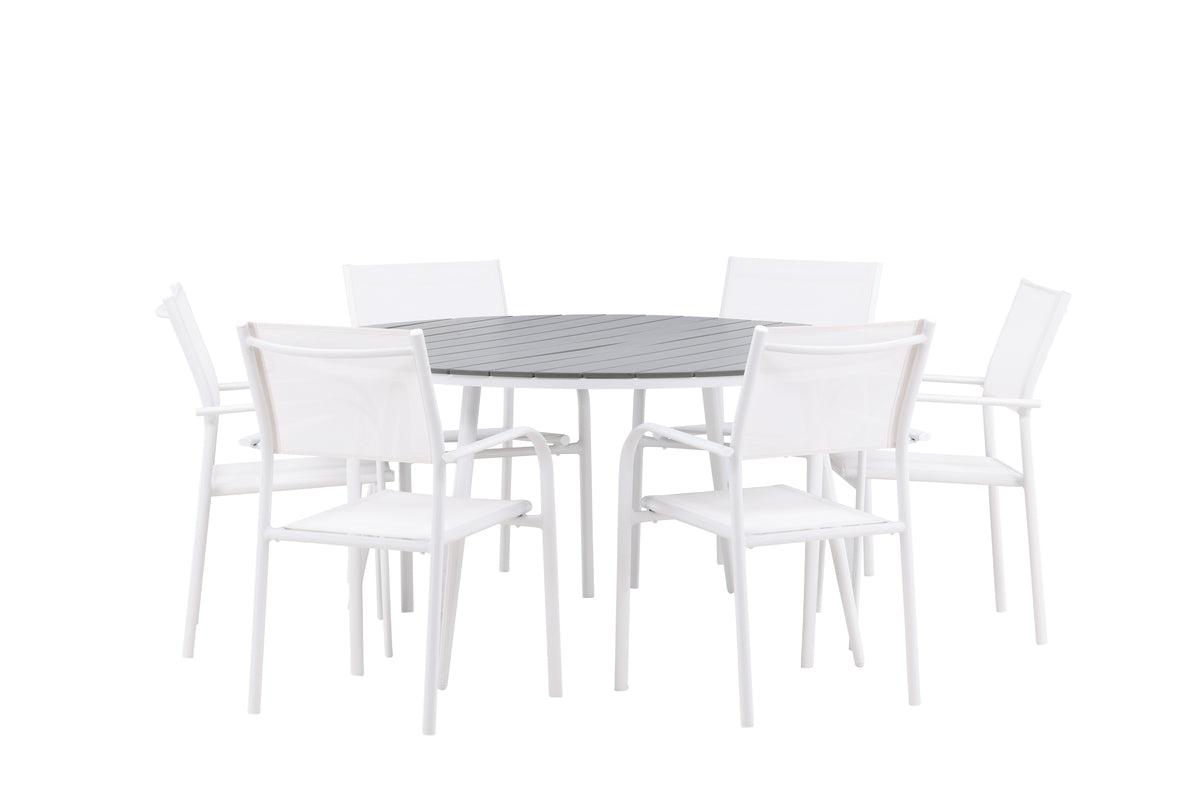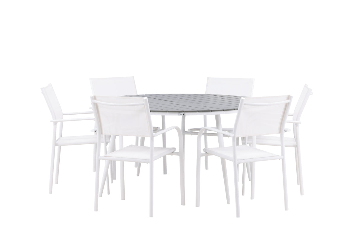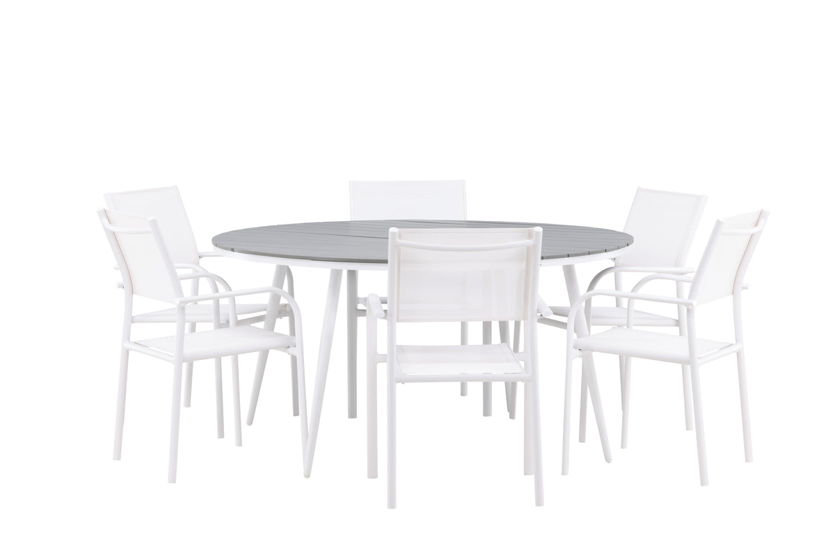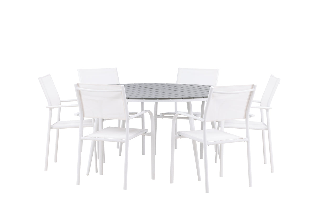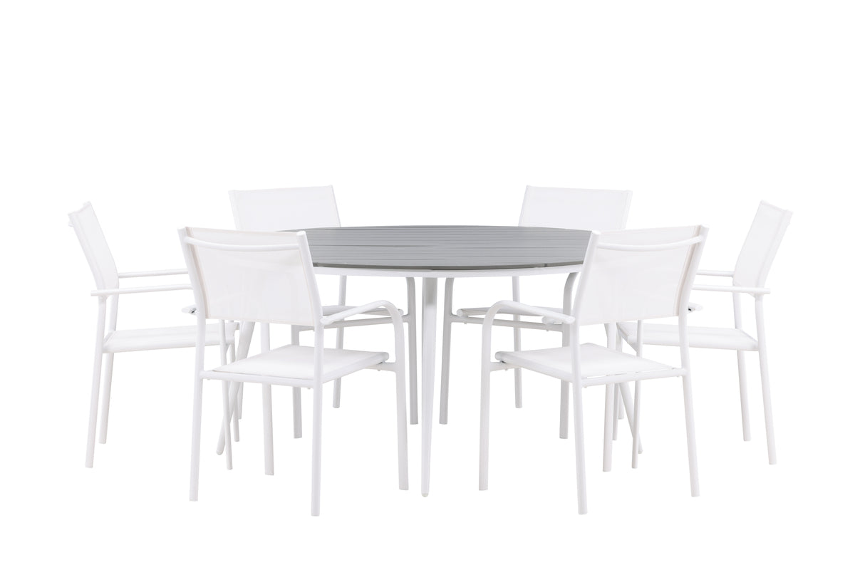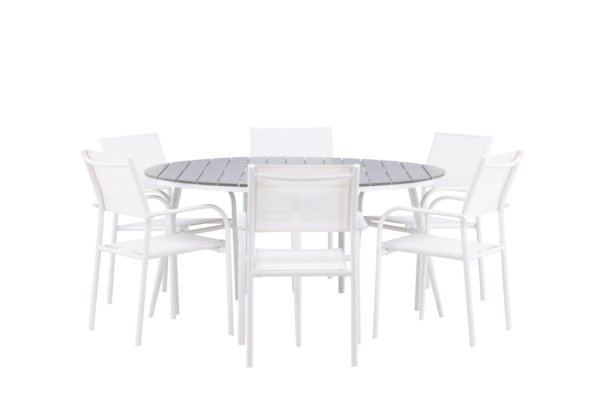Her er der plads til alle, og ingen risikerer at havne på kanten - en rund spisegruppe er perfekt til hyggelige, sociale stunder! Spisebord Break har en rund bordplade i grå aintwood og et klassisk understel i hvid aluminium. Her i perfekt kombination med sorte spisebordsstole fra serien Santorini. Stolene har lige nordiske former med integrerede armlæn i aluminium og et sæde i sort textilene. Lad tiden her blive dagens højdepunkt!