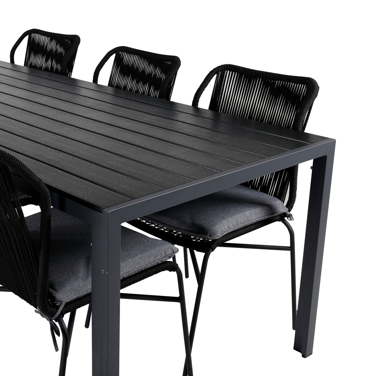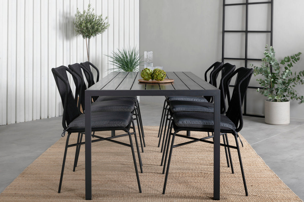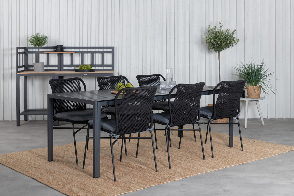 Skab et moderne blikfang på din terrasse i sommer! Her kombineres spisebord Break i sort farve sammen med udtryksfulde spisestole fra serien Julian. Nyd en solrig frokost eller varm sommeraften i denne bekvemme spisegruppe!