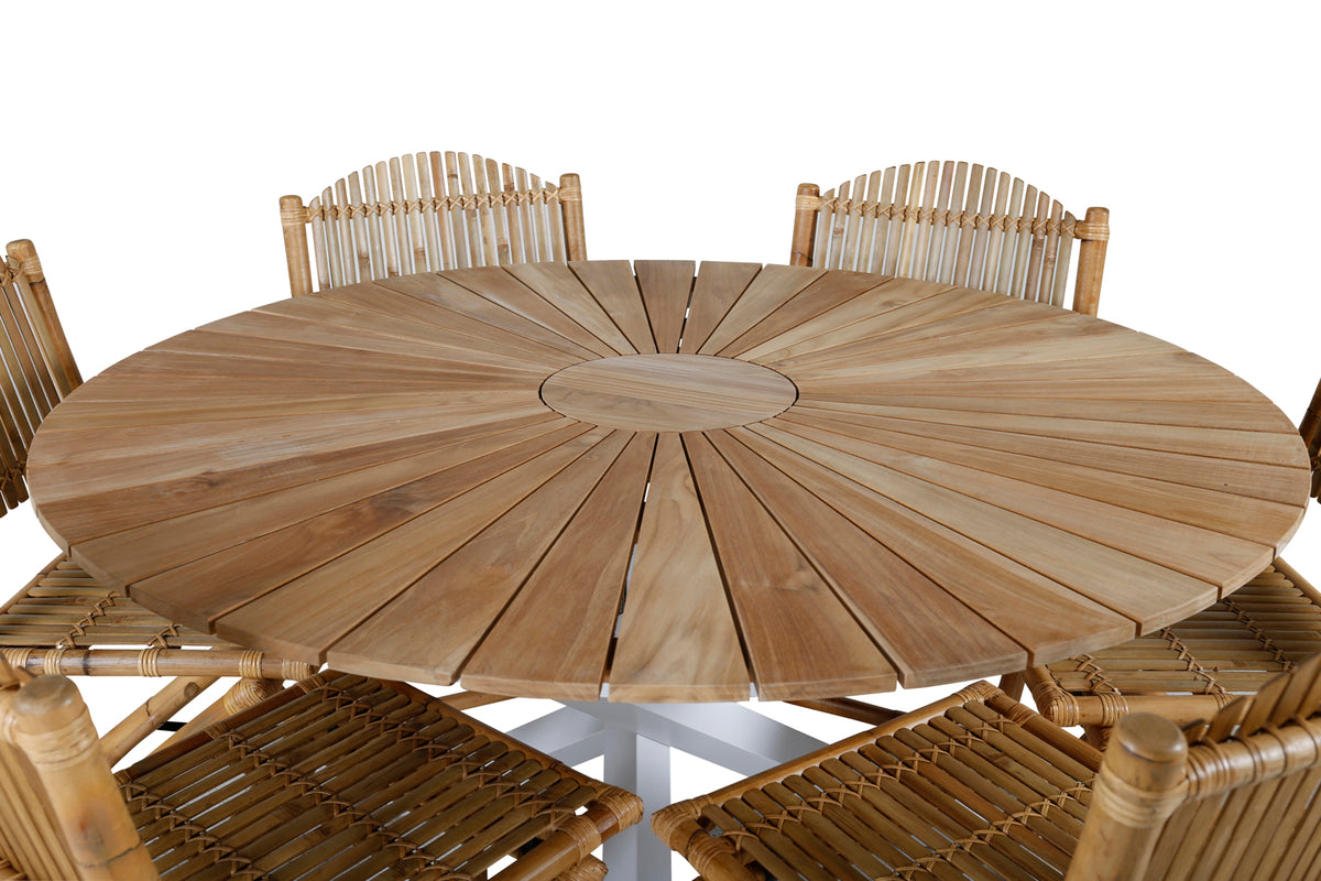 En indbydende spisegruppe med luksuriøst design! Her kombineres det runde spisebord Mexico med trendsikre bambusstole fra serien Cane. Gør dig klar til sommerens udeliv og hyggelige måltider sammen med nære og kære!