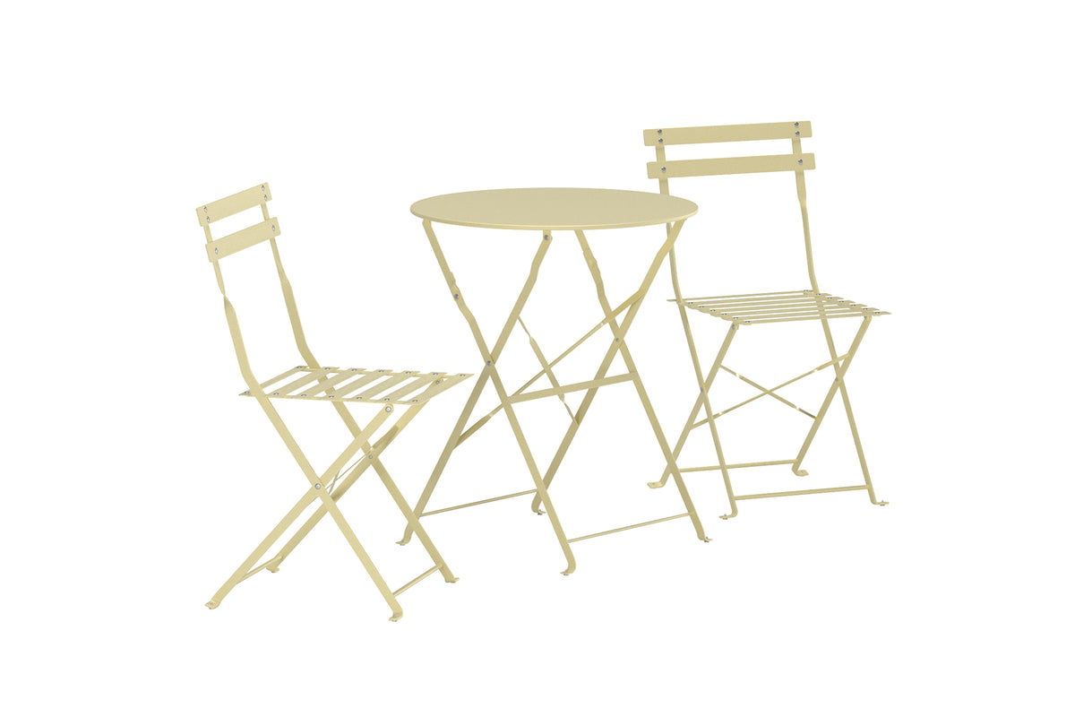 Den lysegule farve spreder glæde og giver en frisk sommerkarakter, der løfter hele miljøet. Både bordet og stolene er sammenklappelige, hvilket gør sættet nemt at opbevare og let at flytte ved behov.