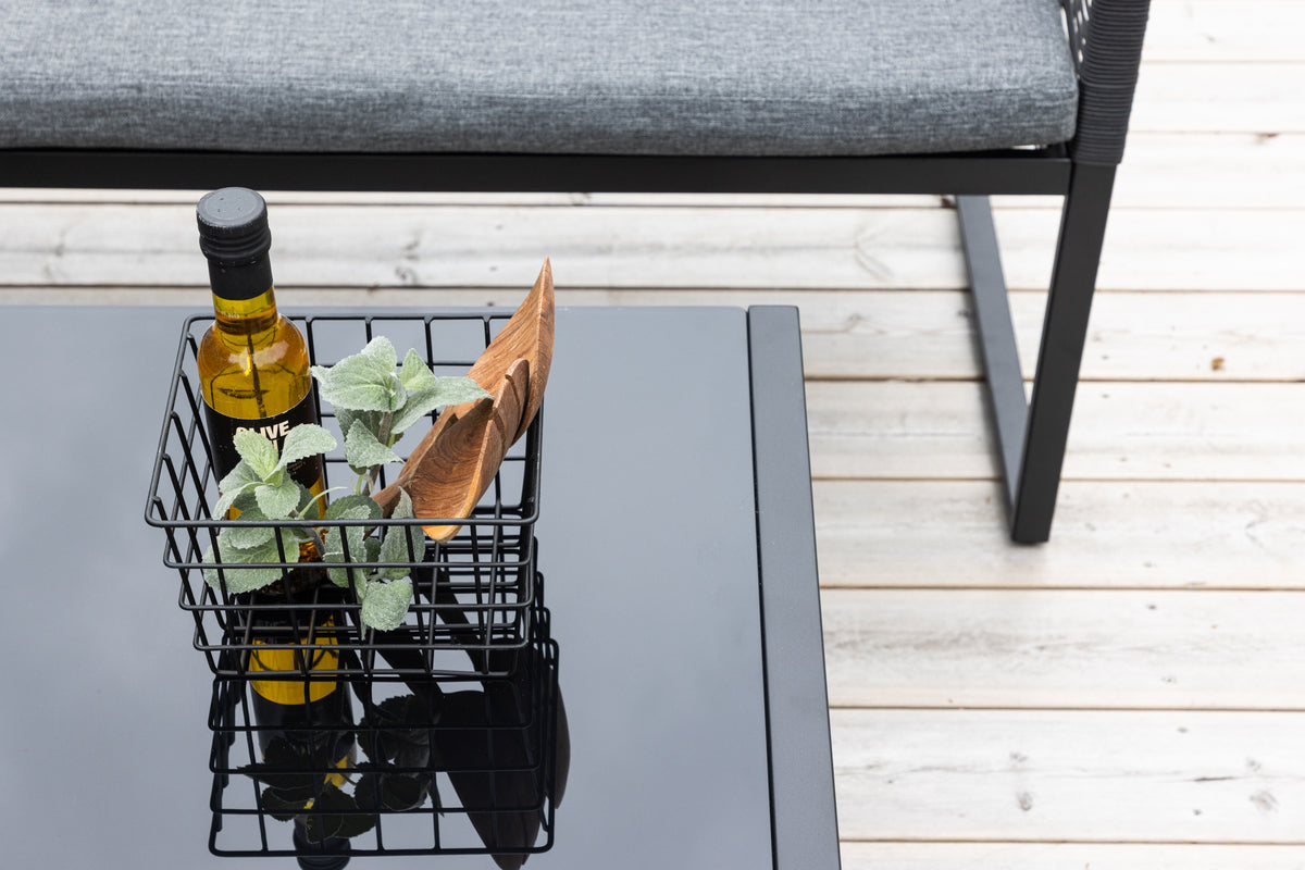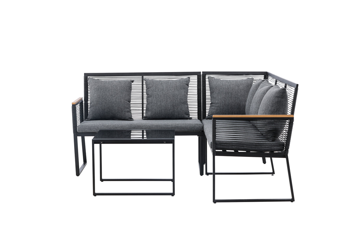 Sæt tonen for afslapning og socialt samvær med denne sorte sofagruppe. Gruppen består af en rummelig hjørnesofa, der tilbyder masser af plads til dig og dine gæster at nyde haveudsigten. Derudover er inkluderet et stilrent bord.