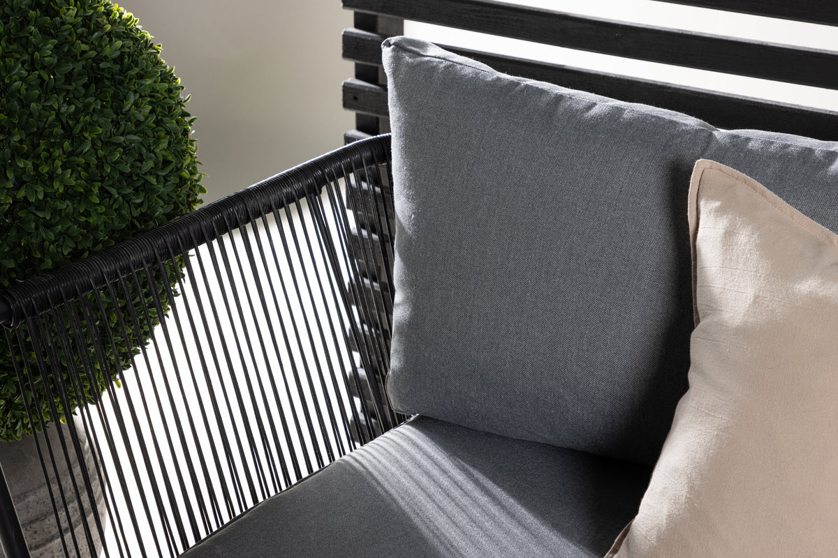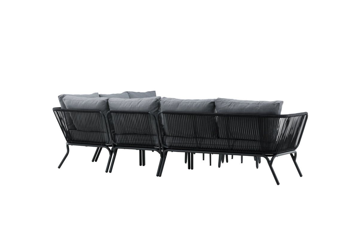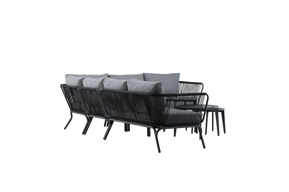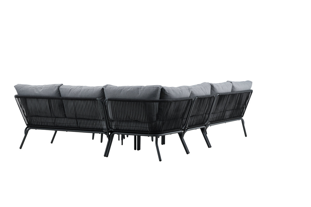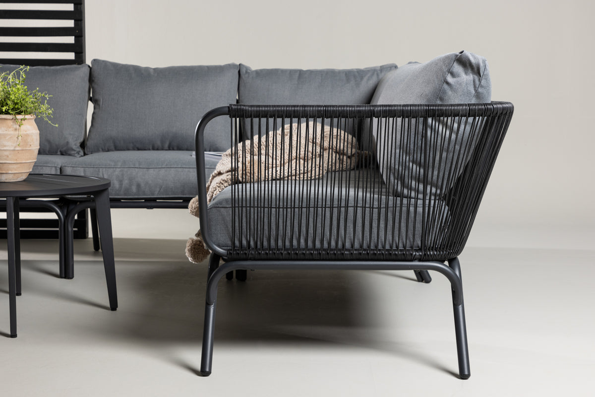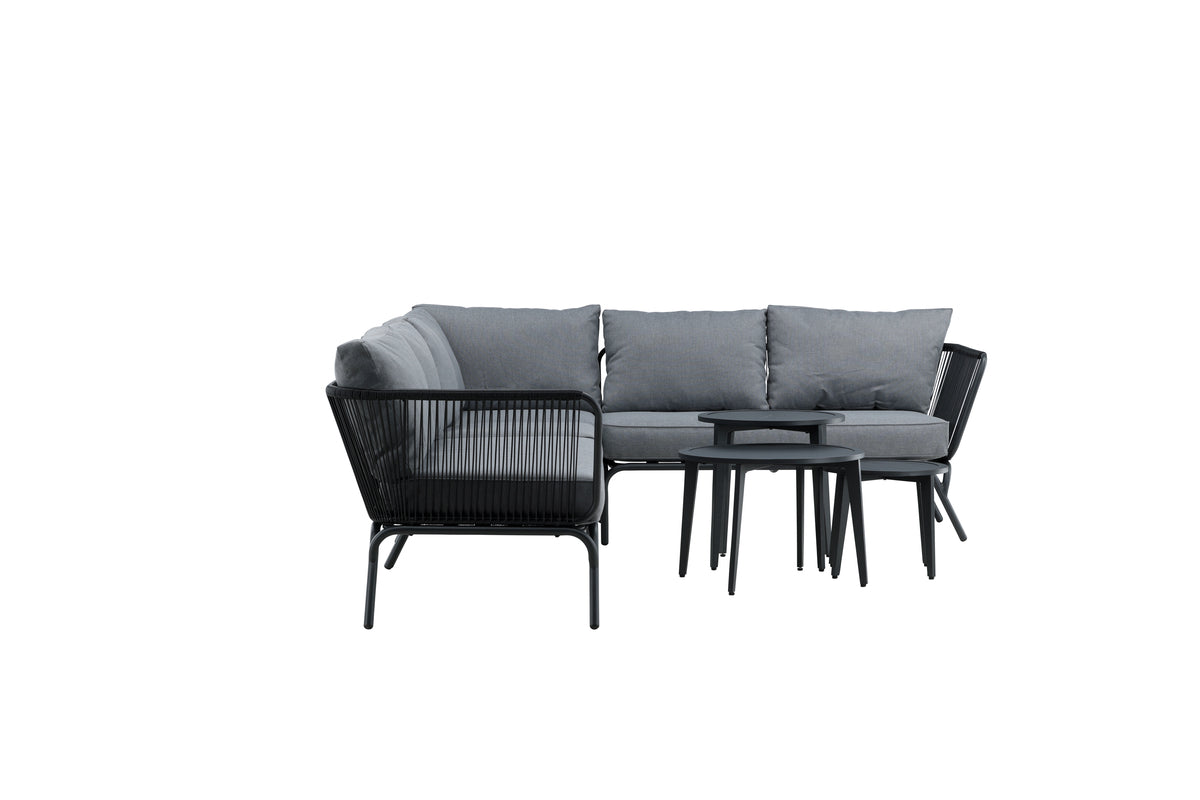 Skab et hyggeligt sted at samle nære og kære omkring til sommer – her sidder I afslappet og komfortabelt i timevis! Roxo er en trendy sofagruppe i stilrent design, der er perfekt til terrassen eller udestuen. Sofagruppen består af en hjørnesofa med 6 siddepladser og en hjørnedel, fremstillet i et slidstærkt design i sort aluminium med en ryg, der er designet i sort reb samt stilrene sideborde i tre dele med bordplader i sort aluminium. Grå bløde hynder medfølger til sofagruppen. Bordenes mål: 50/36/43x50/42/60 cm. Sofaens mål: 63x63x70 cm. Siddemål: 255x64x29,5 cm.