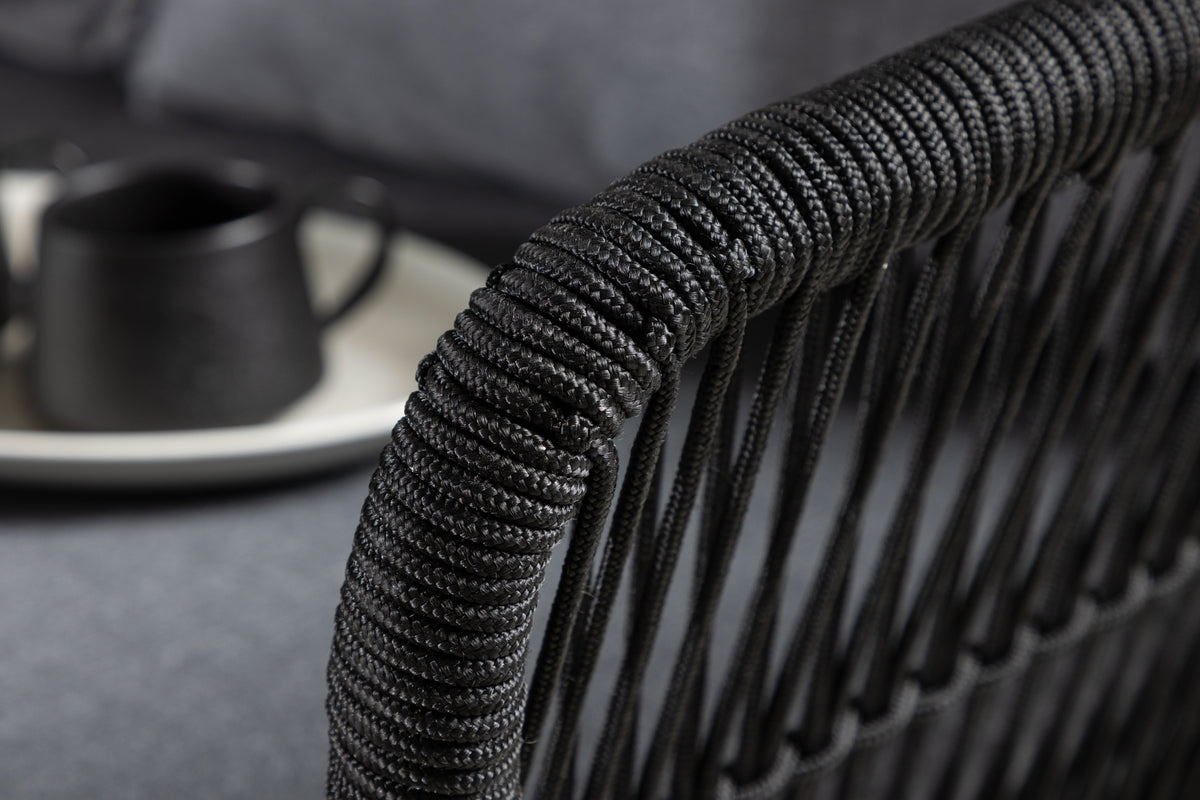 Trendy moderne sofagruppe med fokus på bekvemmelighed. Sofagruppen består af en hjørnesofa med fire siddepladser inklusive tykke slidstærke mørkegrå hynder. Til sofaen medfølger også et lavt sofabord fremstillet helt i akacie. Sofagruppen er fremstillet med en ramme i aluminium med akacie ben, og ryggen og siderne er flettet i et sort reb, der giver et stilrent design. Hjørnesofaens detaljer i akacie sammen med sofabordet skaber en eksklusiv helhedsfornemmelse.