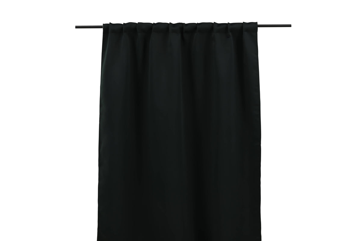 Med Evelyn mørklægningsgardin i en herlig sort elegant kulør fremstillet i polyester skaber du nemt en luksuriøs følelse hjemme. Den jordnære kulør smelter på en harmonisk måde sammen med øvrig indretning, og det solide stof lukker på en flot måde stærkt sollys ude og holder hjemmet svalt og behageligt. Vi anbefaler ved pletter at bruge pletfjerning og lufte tekstilen ofte for at bevare farve og form længere. Ved maskinvask anbefaler vi at vaske gardinen i 30 grader. Mål: 135x240. Indeholder 2 styk gardinlængder.