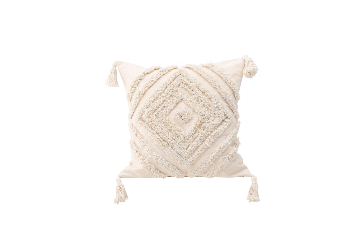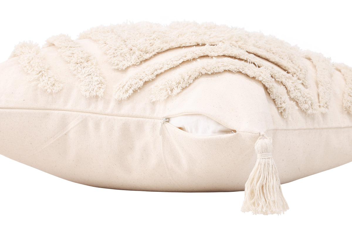 Et kvadratisk pudebetræk helt i linje med tidens trends! Wilda er alle indretningsguruer drøm - cremet hvid i farven, fluffy i teksturen og abstrakt mønster som giver et smukt blikfang. Dette pudebetræk har smigrende kvaster i hvert hjørne og en skjult lynlås forneden. Polyester- og bomuldsblandingen er lige så slidstærk som følsom. Dette er et pudebetræk som udstråler hyggelige dage og varme trivselsfølelser!