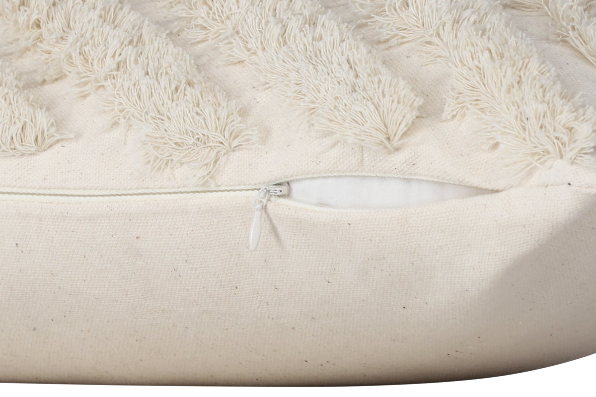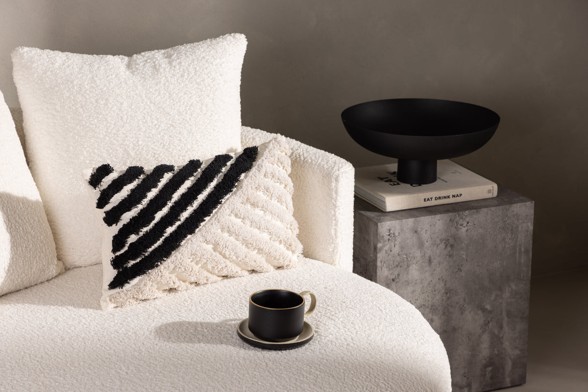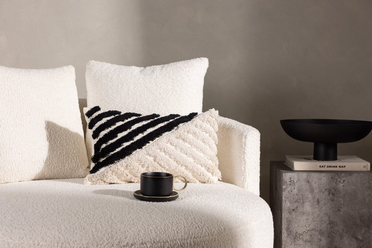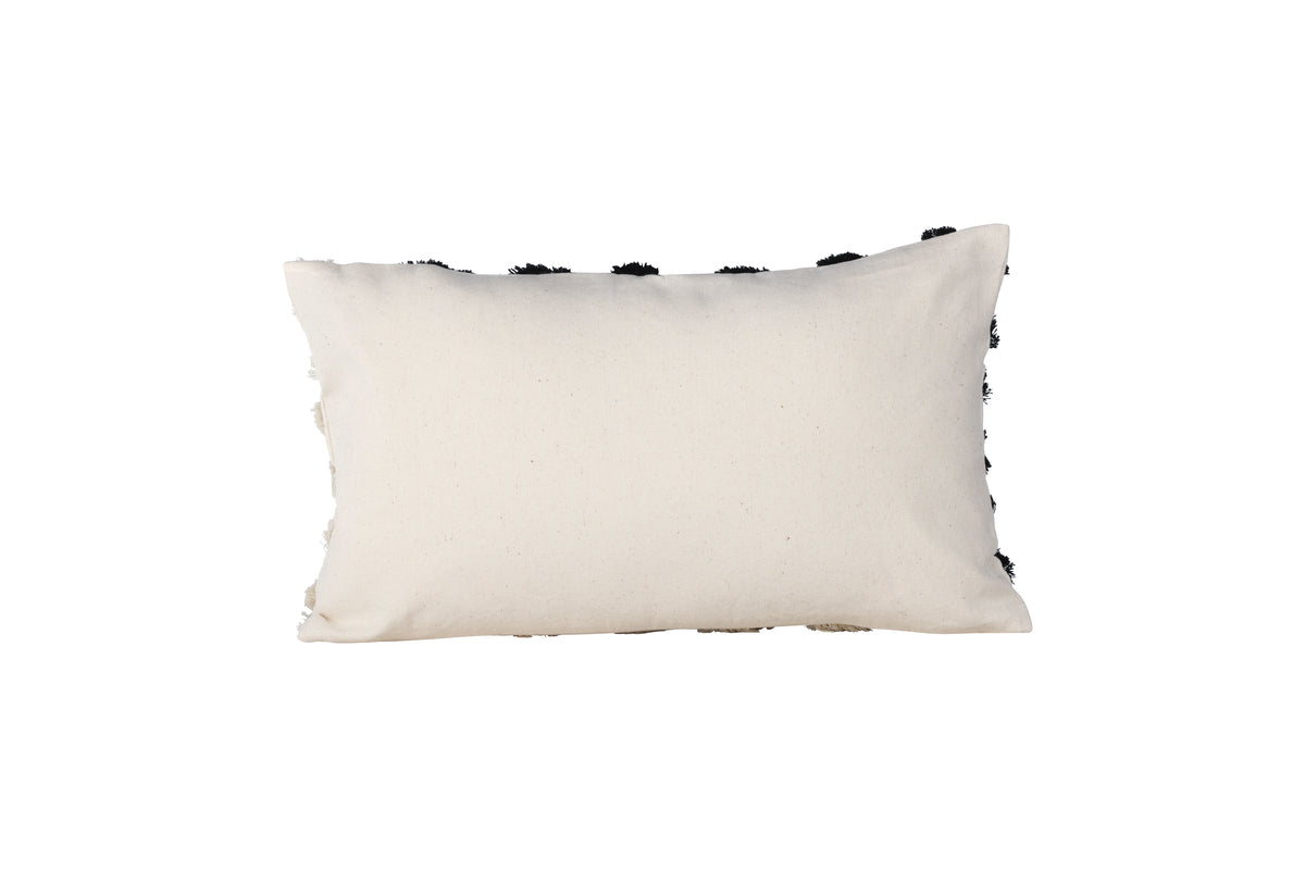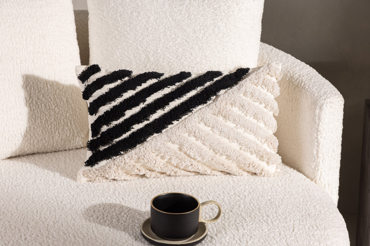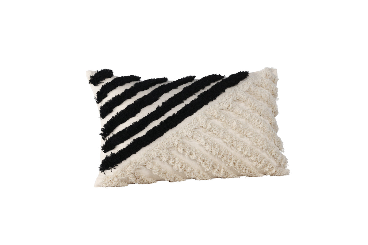 Pynt din sofa eller lænestol med en flot pude fra serien Zara! Dette pudebetræk er både moderne og slidstærkt i poly-bomuldsblanding med et tuftet mønster, som giver både liv og struktur til puden. Pudebetrækket findes i to forskellige størrelser, her en langsmal udformning. Farvebasen er i cremet beige kulør, og halvdelen af det abstrakte, lineære mønster er i sort. Match og variér med andre pudebetræk rundt omkring, og lad dette stå i centrum!