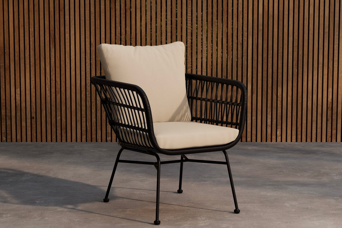Isola stol er en stilfuld og komfortabel loungestol med sort ramme og bløde beige hynder. Det luftige design og de lige linjer giver stolen et moderne udtryk, samtidig med at de generøse hynder gør den dejlig indbydende at slå sig ned i. Perfekt som solitær på balkonen eller i kombination med Isola sofaen for et komplet loungemiljø. Isola stol er valget for dig, der vil kombinere moderne design med afslappet komfort.