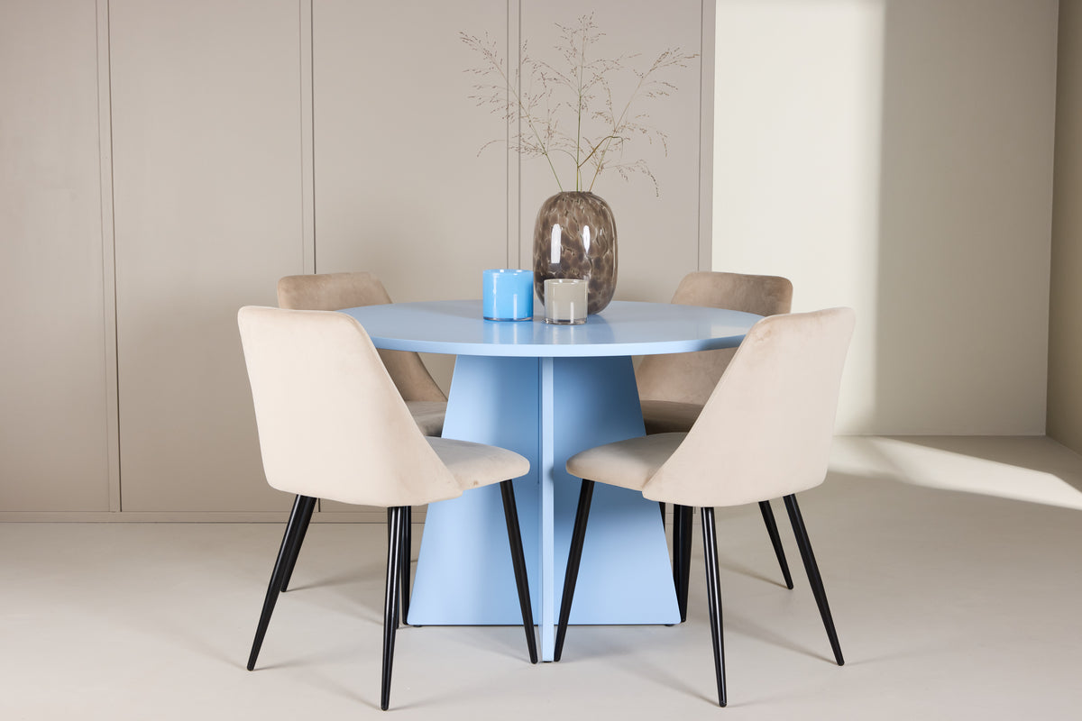 Spisebordet Bootcut fanger opmærksomheden med sin runde form og bløde babyblå nuance. Bordets diameter giver en luftig og frisk følelse, hvilket gør det til et perfekt samlingspunkt for både hverdagsmåltider og festlige lejligheder. Bootcut er ikke bare et bord, men et statement-piece, der forvandler dit spiserum og skaber et inspirerende miljø for alle dine måltider. Spisestolene Night er det perfekte supplement til Bootcut. Betrukket med blød beige velour giver de en indbydende og sofistikeret følelse, der løfter hele din spiseplads. Den neutrale beige tone smelter smukt ind i forskellige indretningsstile, samtidig med at den sorte benkonstruktion giver en stilfuld kontrast. Night-stolenes ergonomiske design giver god rygstøtte og sikrer komforten ved både lange og afslappende middage. Kombinationen af den bløde velour og de stabile, sorte ben skaber et afbalanceret og elegant look, der bliver et naturligt midtpunkt rundt om spisebordet.