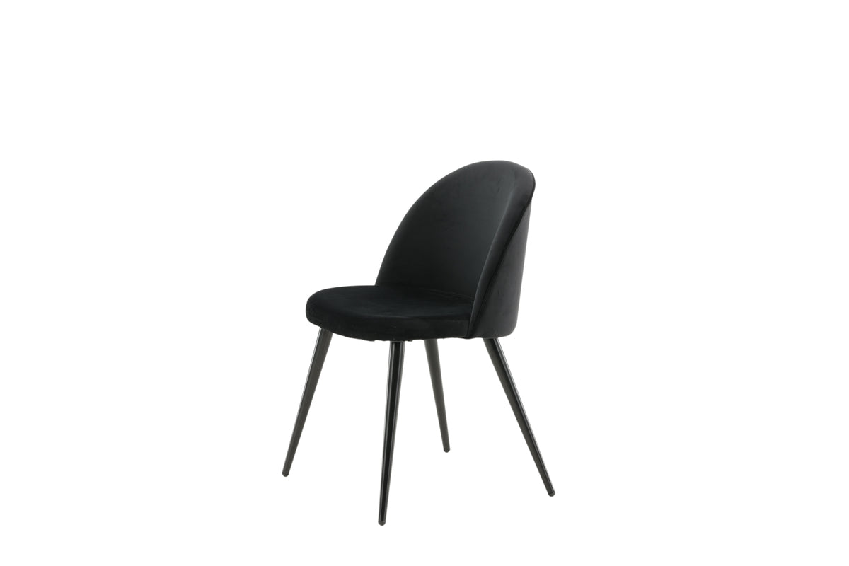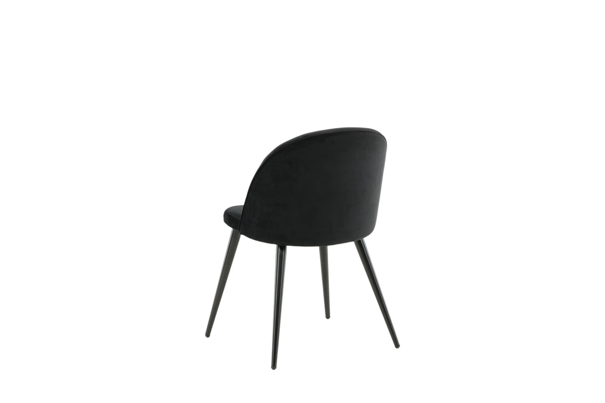 Stilren spisebordsstol i gennemgående sort farve med moderne udformning - hvad mere kan man ønske? Den sorte spisebordsstol Velvet har et fuldt polstret design, ben i sort pulverlakeret metal samt afrundet ryg og sæde i sort fløjl med blød polstring. Slip for at gå på kompromis mellem komfort og design! Lettere montering kræves.
