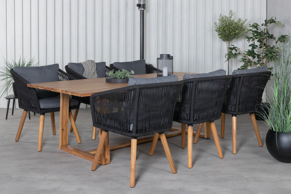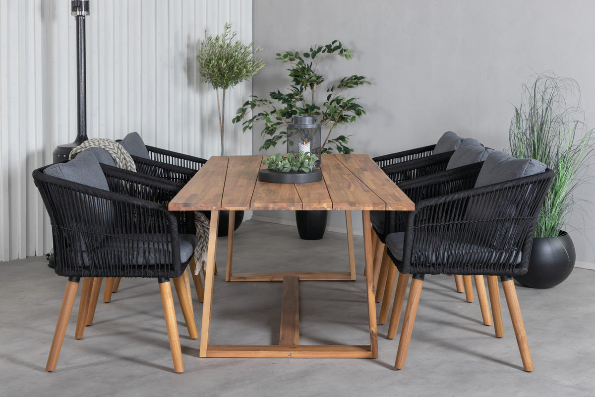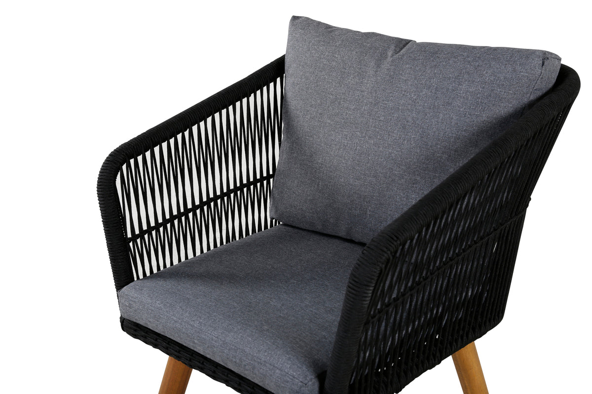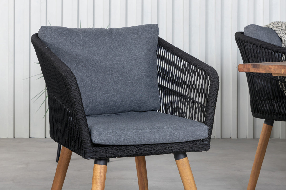 Chania, en bekvem armstol fremstillet i sort reb. Stolen er blevet en favorit i mange husholdninger - takket være sit enkle og smagfulde design. Skab et moderne og charmerende midtpunkt på terrassen, hvor du, familie og venner kan samles til hyggelige måltider!
