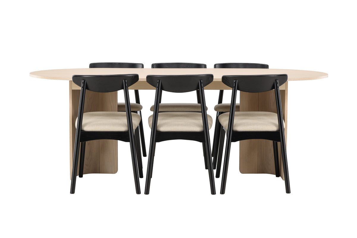 Rundt om bordet samles Ven-stolene med deres sorte ramme og blødt beige sæde – en stilren kontrast, der tilfører dybde og karakter til helheden. Sammen danner de en afbalanceret og tidløs spisebordssæt, der passer lige så godt til hverdagens hurtige måltider som til lange aftener med venner og familie.