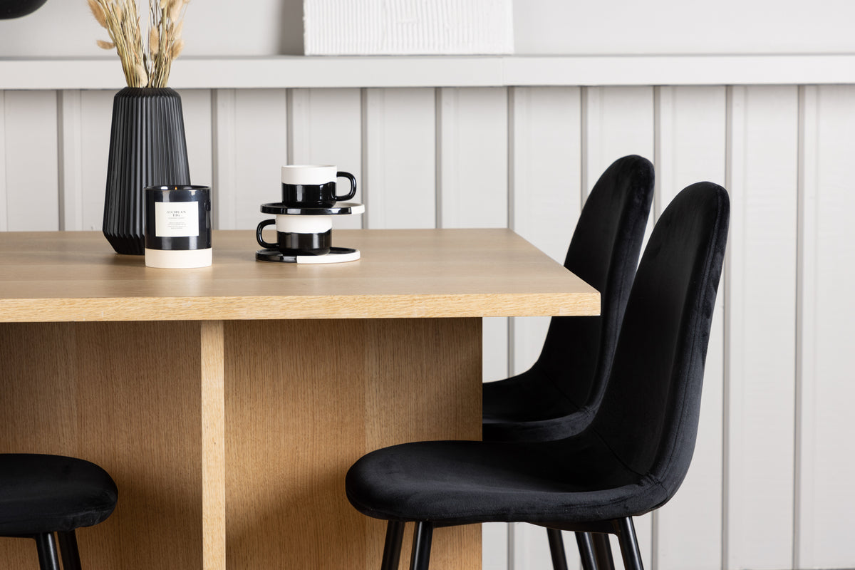 Sammen med det træfarvede spisebord Leo kommer vores sorte spisestole Polar. Disse stole er udformet med omhu og tilbyder en perfekt balance mellem stil og komfort. De har et helbeklædt design, og sædet er i blødt sort fløjl, som giver en luksuriøs følelse. De sort pulverlakerede metalben giver et moderne touch og sikrer god stabilitet.