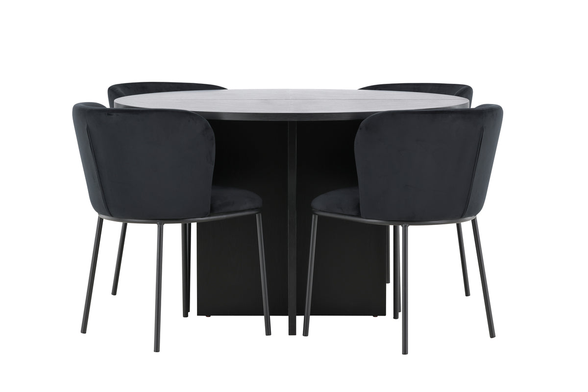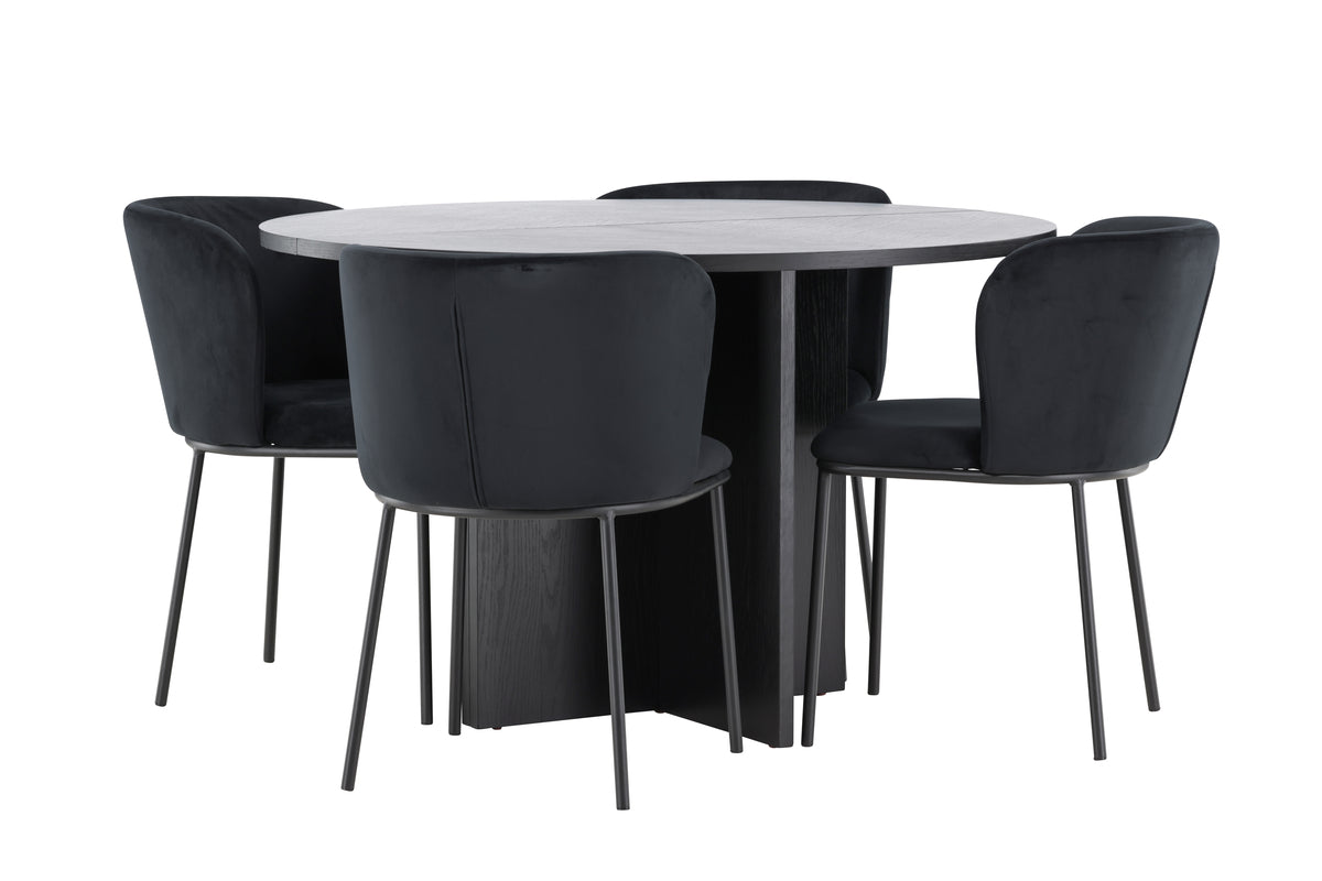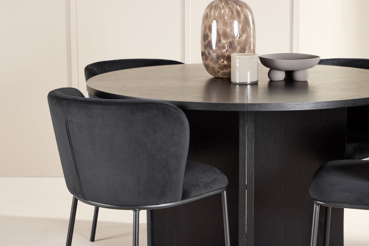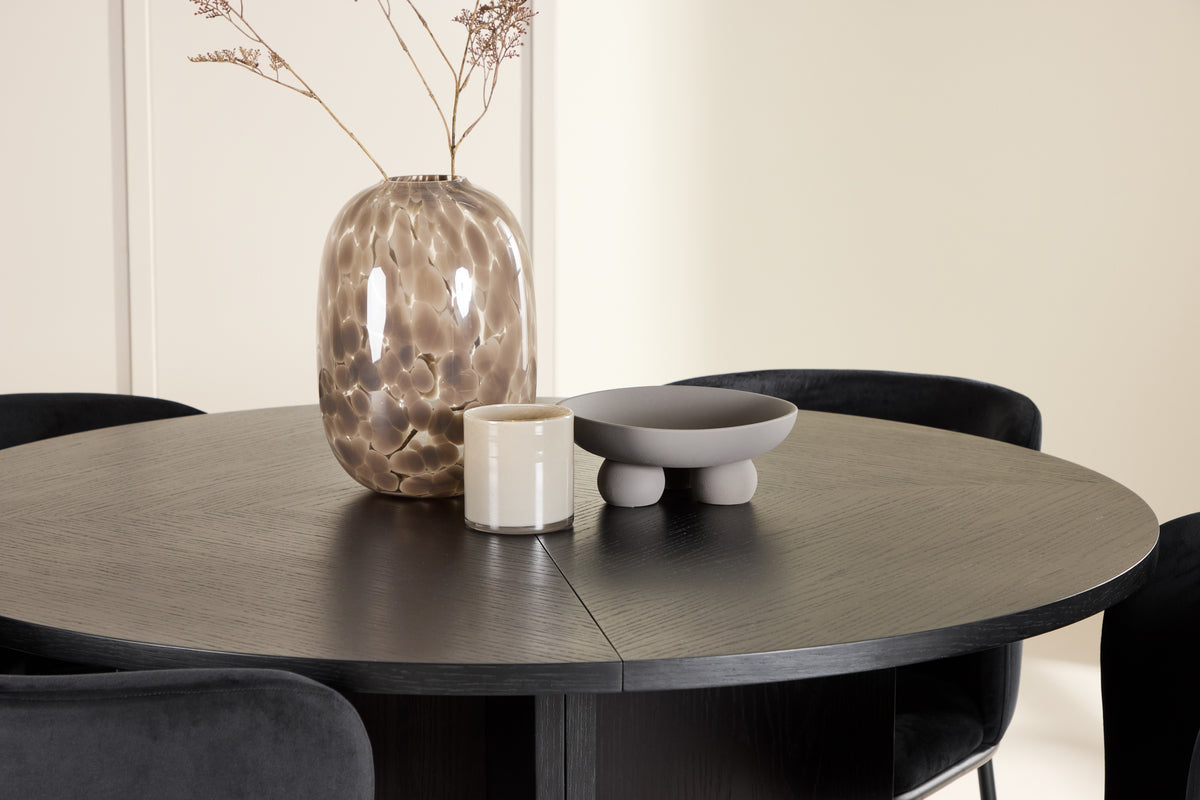 Spisebordet Strada er fremstillet i sort finer, hvilket giver en moderne og tidløs følelse. Med en diameter på 120 cm passer det perfekt til mindre måltider, men kan nemt forlænges til 170 cm, når du har brug for mere plads til gæster. Bordets forlængelsesfunktion er enkel at bruge og giver dig både fleksibilitet og stil. Den sorte finerkonstruktion fremhæver bordets rene linjer og elegante design, hvilket gør det til et alsidigt valg, der passer til mange indretningsstile, fra minimalistisk til klassisk.