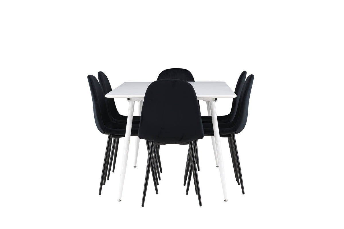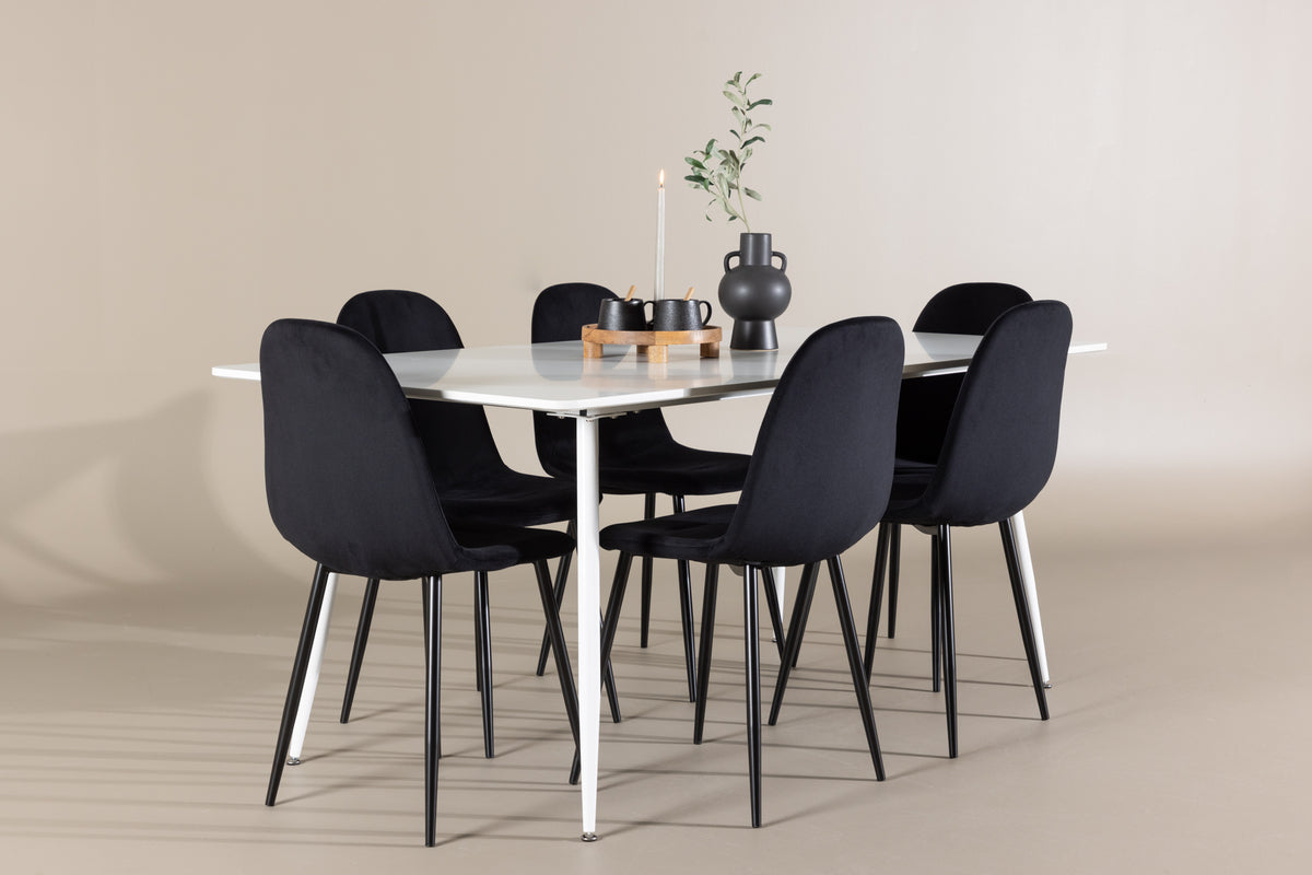 Oplev den perfekte spisegruppe med Polar spisestol og Silar spisebord, en kombination af stilrent design og funktionalitet. Polar spisestol har en gennemgående sort farve med moderne udformning. Dens helbeklædte design, ben i sort pulverlakeret metal, afrundet ryg og sæde i sort velourstof med blød polstring tilbyder både komfort og elegance. Slip for at gå på kompromis mellem komfort og design! Lettere montering kræves. Vedligeholdelsesråd: Velour har en tendens til at få trykmærker, når luven lægger sig ned, hvilket er helt normalt for denne type materiale. Afhængigt af hvordan lyset falder, kan stoffet skifte i flere forskellige nuancer.