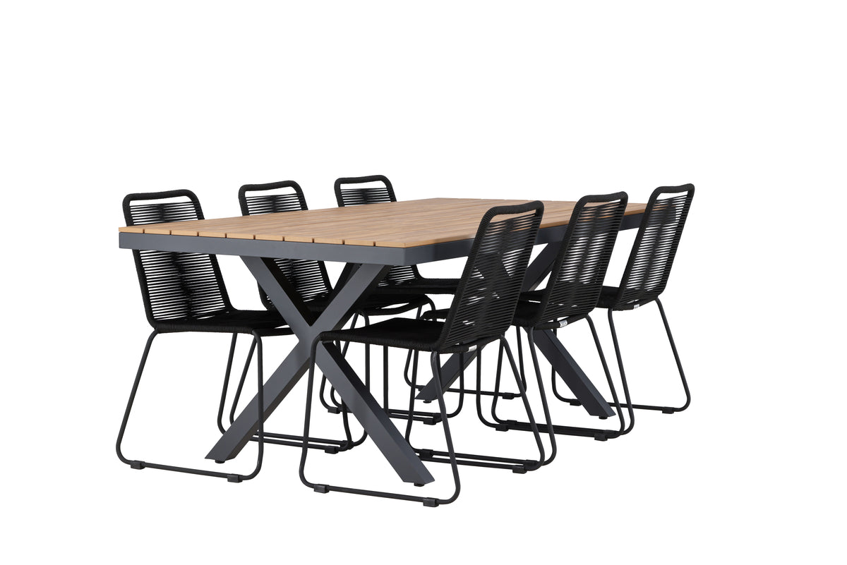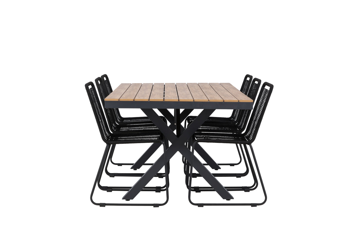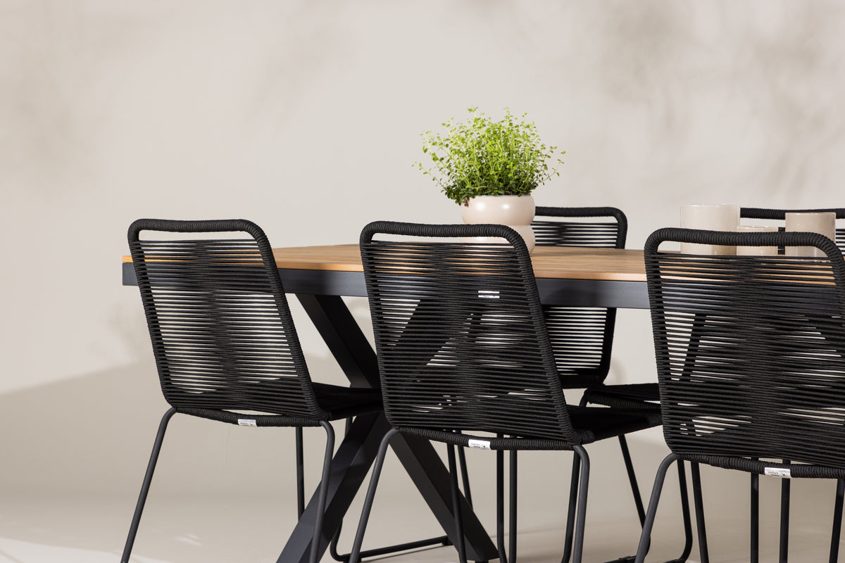 Stolene Lindos er det ultimative supplement til Garcia-bordet. Fremstillet med reb og stålben i en elegant sort farve, tilbyder disse stole både stil og komfort til din udendørs afslapning. Med seks inkluderede stole er denne spisegruppe perfekt til at samle familie og venner til mindeværdige stunder under åben himmel.