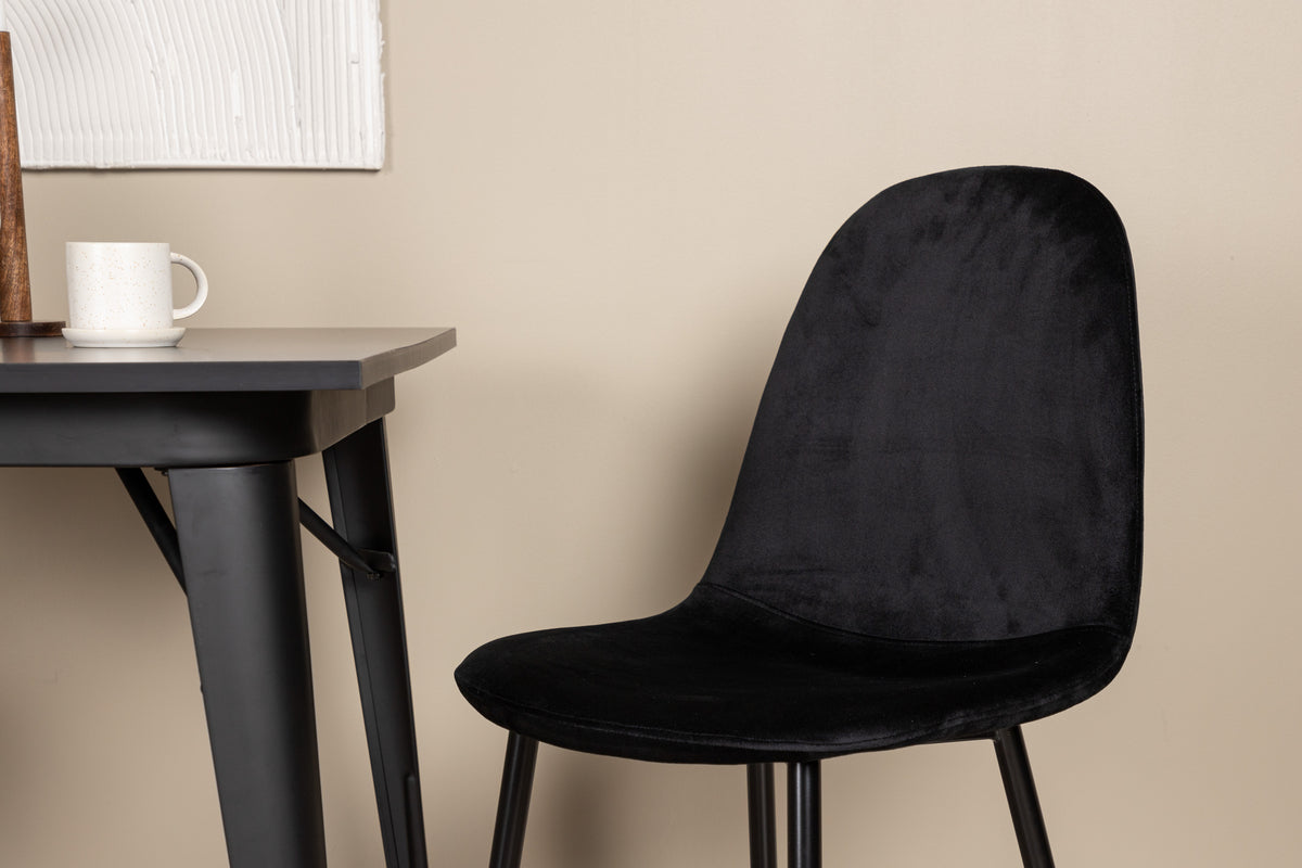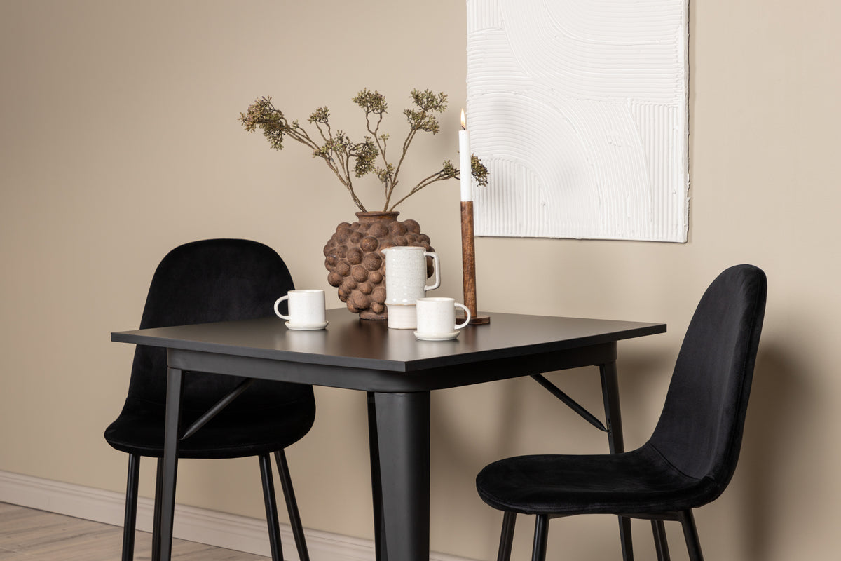 En charmerende spisegruppe til to - perfekt til det lille køkken! Dette spisebord fra serien Tempe har et klassisk, kvadratisk design og en tidløs sort farve. Bordpladen er i sort MDF og bordbenene i sort metal. Her i smagfuld kombination med to spisebordsstole fra serien Polar i sodet sort nuance. Stolen har et fuldpolstret design med et afrundet ryglæn og sæde i sort velourstof med blød polstring og ben i sort pulverlakeret metal. Undgå at gå på kompromis mellem komfort og design!