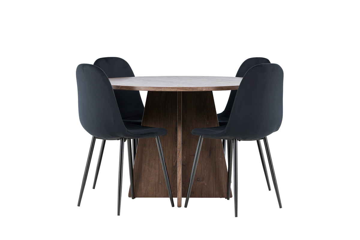 De fire Polar-stole komplementerer bordet perfekt med deres elegante sorte sæder i blød velour. Disse stole tilbyder både komfort og stil, hvilket gør dem ideelle til lange, behagelige middage med familie og venner. Deres moderne design med højt ryglæn og luksuriøse sæder giver dit spiserum et sofistikeret og moderne touch.