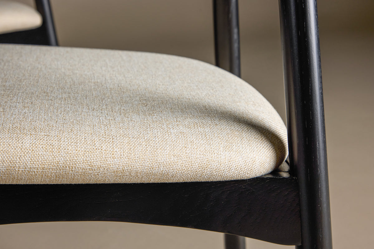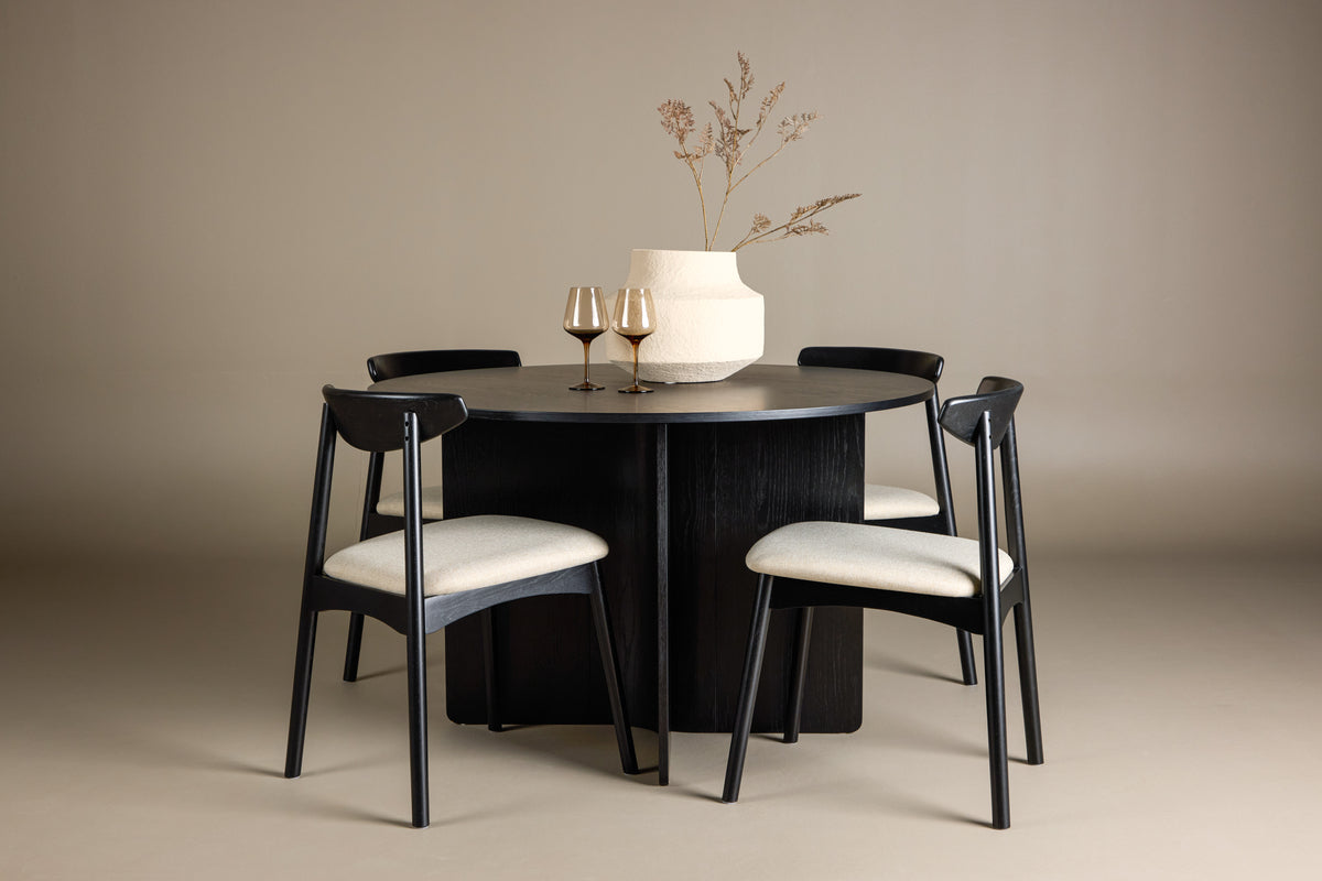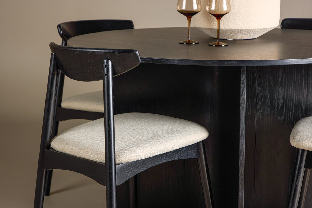 Rundt om bordet står den stilfulde Ven-stol, hvis sorte ramme passer ind med bordet, mens den beige hynde tilfører en varm og blød kontrast. Sammen skaber de en balanceret helhed, hvor farve og form spiller sammen på en smagfuld måde.