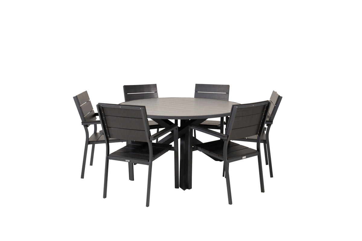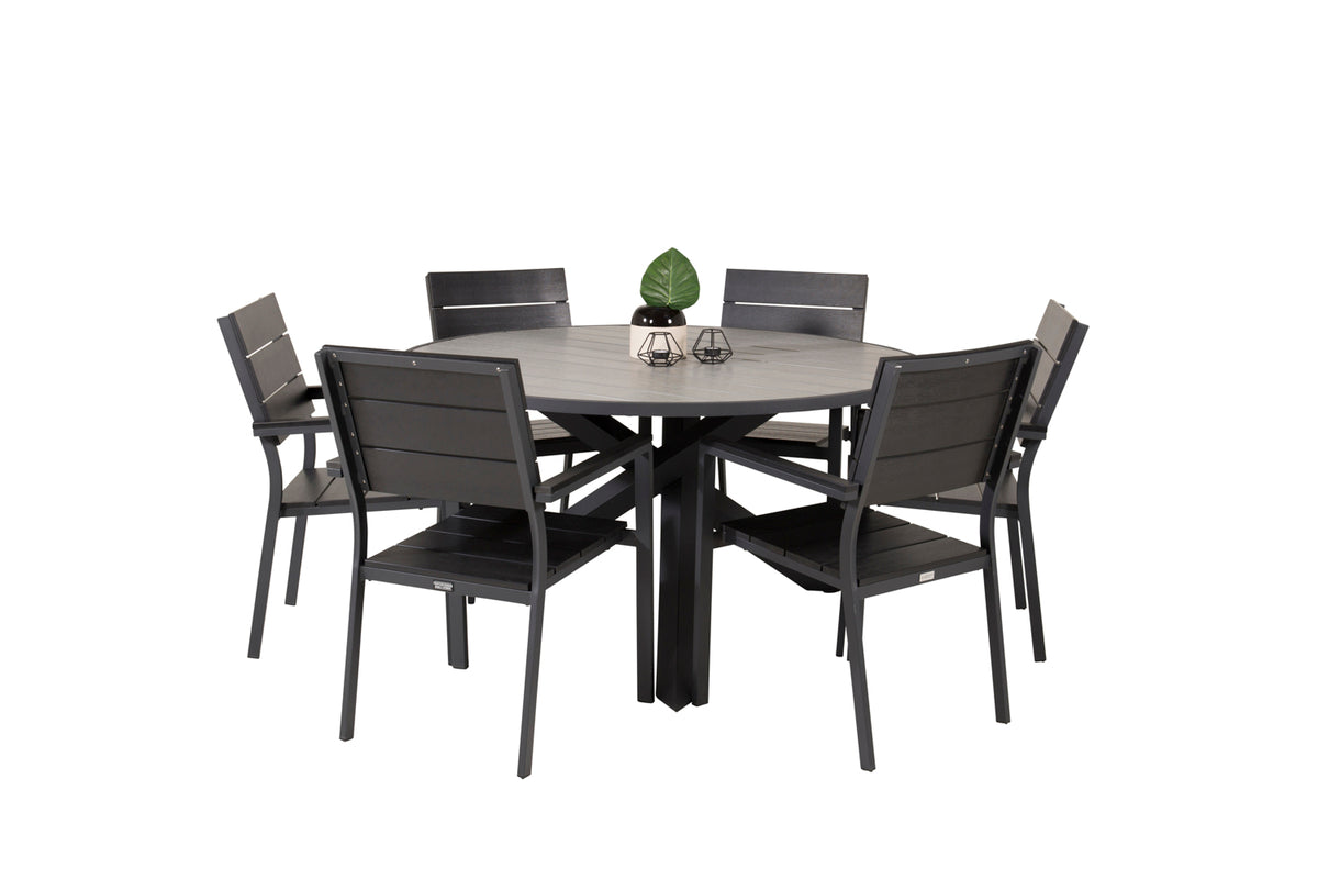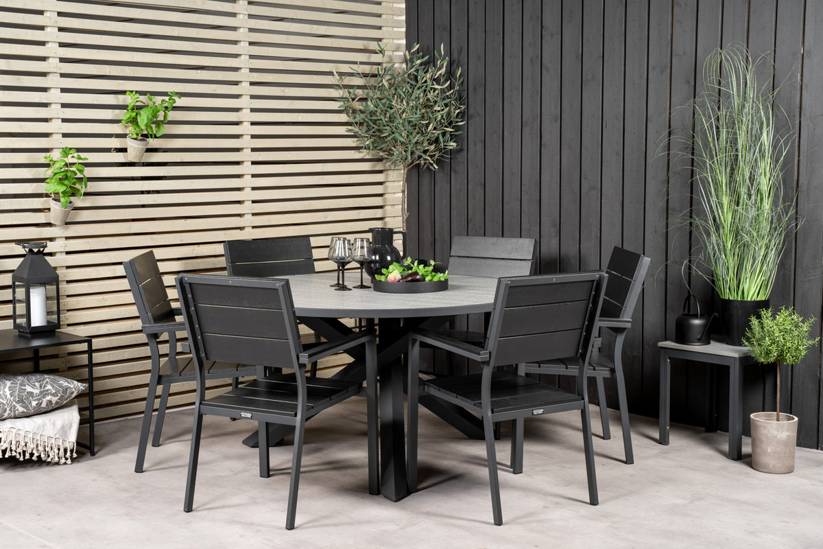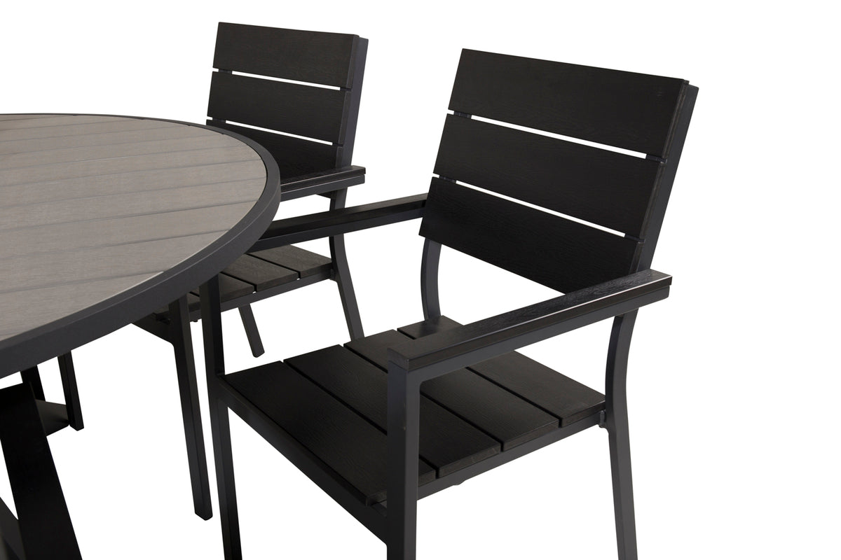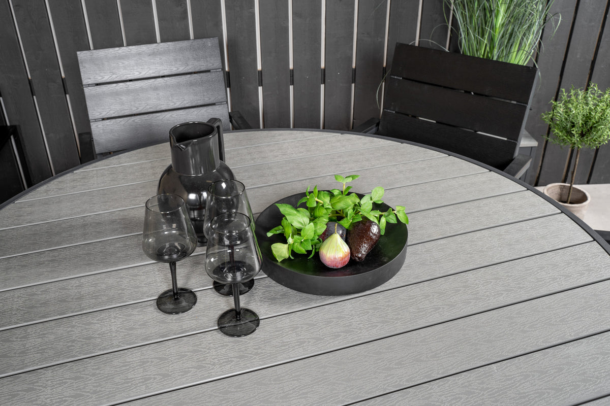 Møblér din terrasse med denne stilfulde spisegruppe! Vores runde spisebord Parma giver en familiær følelse. Her sammen med sorte træstole i serien Levels. Forlæng den solrige frokost i en behagelig spisegruppe!